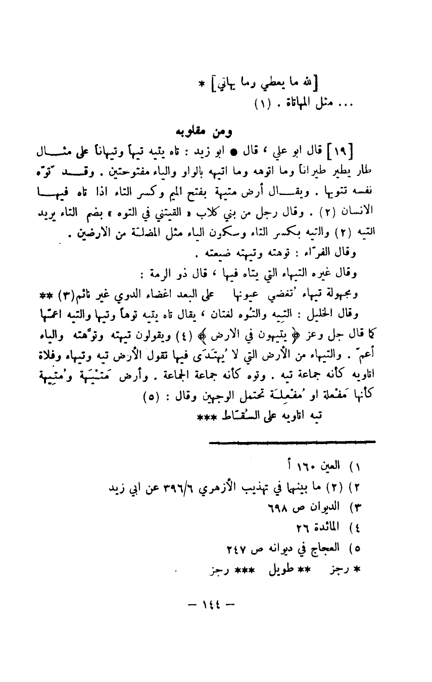 قال أبو علي، قال أبو زيد: تاه يتيه تيهًا وتيهانًا على مثال طار يطير طيرانًا وما أتوهه وما أتيهه بالواو والياء المفتوحتين. وقد تَوّه نفسه تتويها. ويقال أرض متيهة بفتح الميم وكسر التاء إذا تاه فيها الإنسان. وقال رجل من بني كلاب "ألقيتني في التوه" بضم التاء يريد التيه والتيه بكسر التاء وسكون الياء مثل المضلّة من الأرضين.