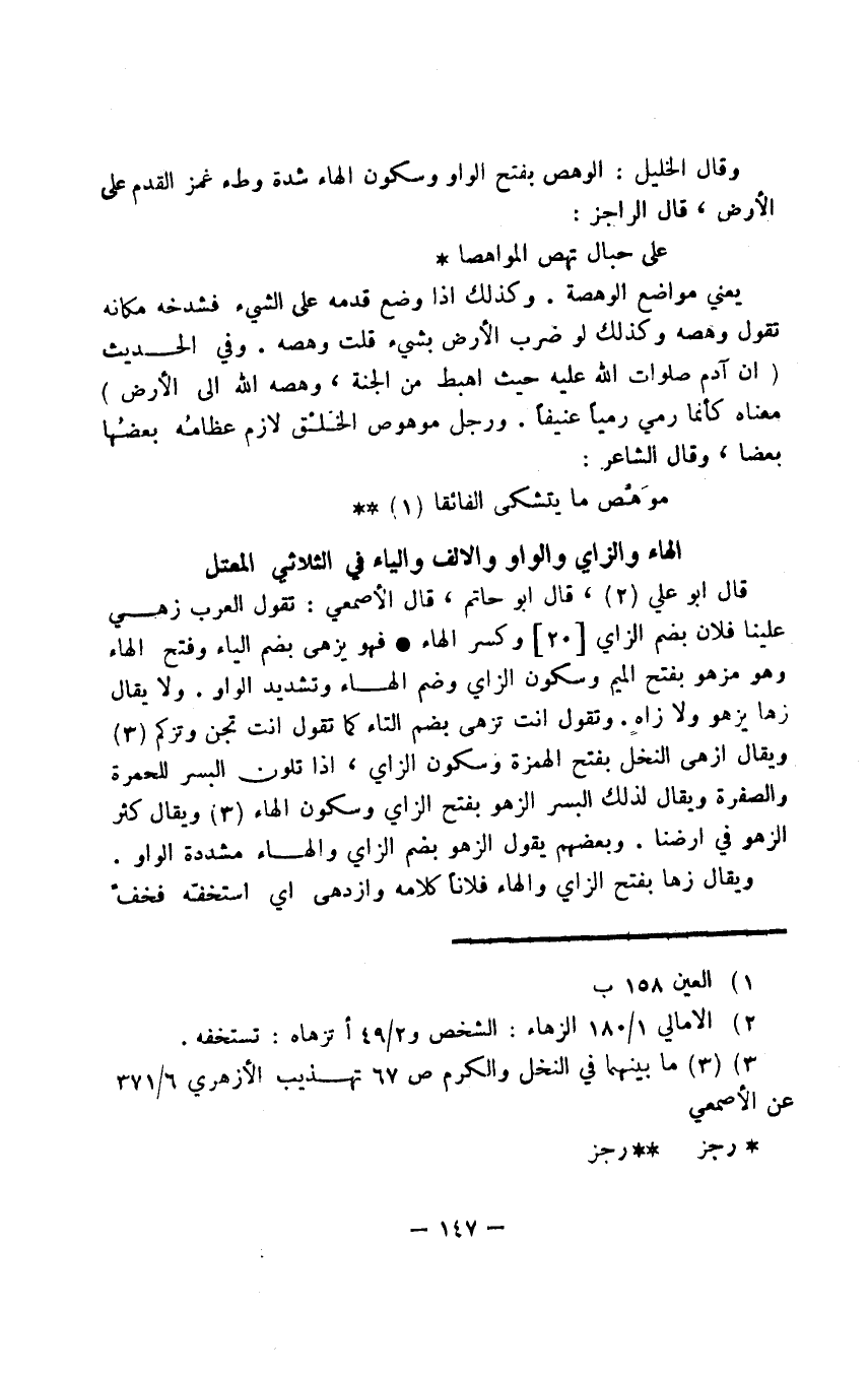 يعني مواضع الوهصة. وكذلك إذا وضع قدمه على الشيء فشدخه+ مكانه تقول وهصه وكذلك لو ضرب الأرض بشيء قلت وهصه. وفي الحديث "إن آدم صلوات الله عليه حيث أهبط من الجنة، وهصه الله إلى الأرض" معناه كأنما رمي رميًا عنيفًا. ورجل موهوص الخَلْق لازم عظامُه بعضُها بعضًا، وقال الشاعر: