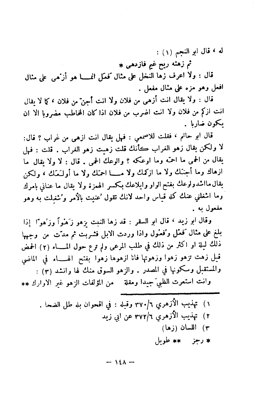 وقال أبو زيد: قال أبو السقر: قد زها النبت يزهو زَهْوًا وزُهوّا إذا بلغ على مثال فَعْل وفُعُول وإذا وردت الإبل فشربت ثم مدّت من وجهها ذلك ليلة أو أكثر من ذلك في طلب المرعى ولم ترع حول الماء الحمض قيل زهت تزهو زهوا وزهوتها فأنا أزهوها زهوا بفتح الهاء في الماضي والمستقبل وسكونها في المصدر. والزهو السوق منك لها وأنشد:
