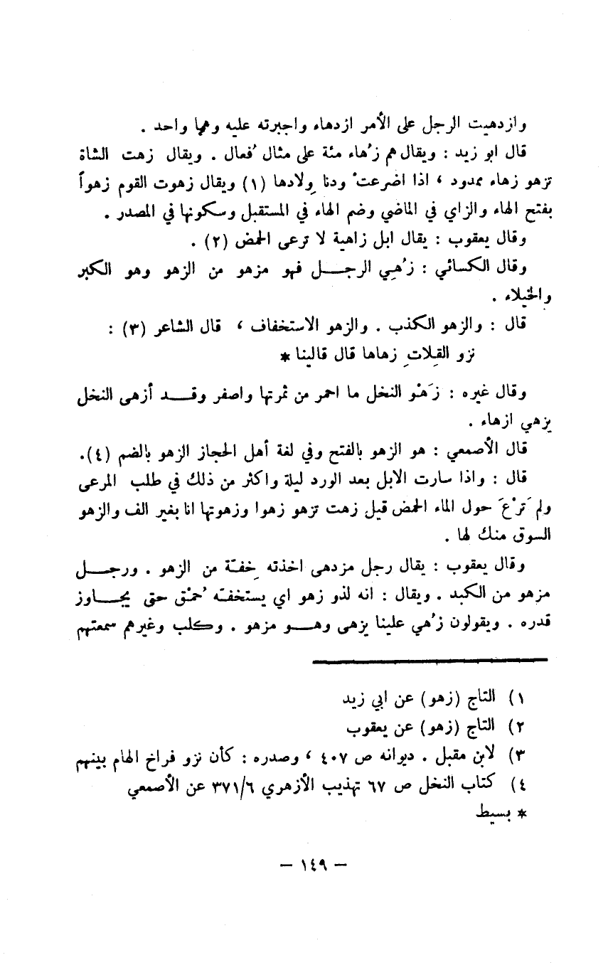 وقال يعقوب: يقال رجل مزدهى أخذته خِفّة من الزهو. ورجل مزهو من الكبد. ويقال: إنه لذو زهو أي يستخفّه حُمْق حق يجاوز قدره. ويقولون زُهي علينا يزهى وهو مزهو. وكلب وغيرهم سمعتهم