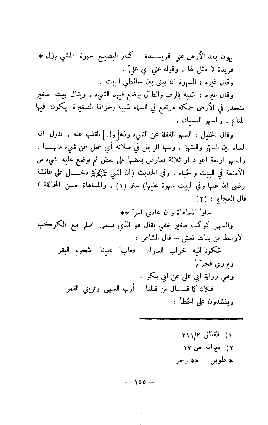 وقال الخليل: السهو الغفلة عن الشيء وذهول القلب عنه. تقول إنه لساه بين السَّهْو والسُّهوِّ. وسها الرجل في صلاته أي غفل عن شيء منها. والسهو أربعة أعواد أو ثلاثة يعارض بعضها على بعض ثم يوضع عليه شيء من الأمتعة في البيت والخباء. وفي الحديث (أن النبي صلى الله عليه وسلم دخل على عائشة رضى الله عنها وفي البيت سهوة عليها ستر). والمساهاة حسن المخالقة، قال العجاج: