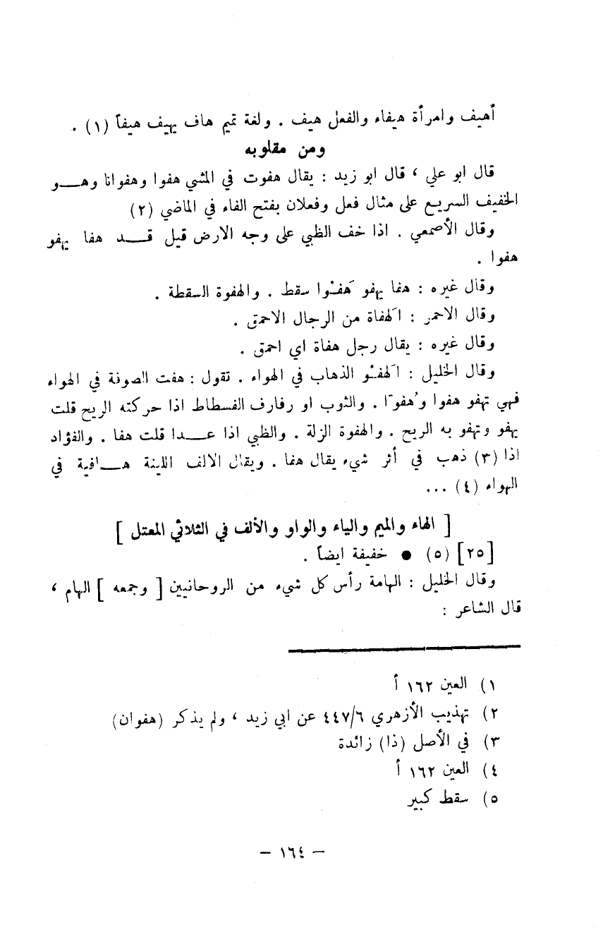 وقال الخليل: الهَفْو الذهاب في الهواء. تقول هفت الصوفة في الهواء فهي تهفو هفوا وهُفوًّا. والثوب أو رفارف الفسطاط إذا حركته الريح قلت يهفو وتهفو به الريح. والهفوة الزلة. والظبي إذا عدا قلت هفا. والفؤاد إذا ذهب في أثر شيء يقال هفا. ويقال الألف اللينة هافية في الهواء ...
