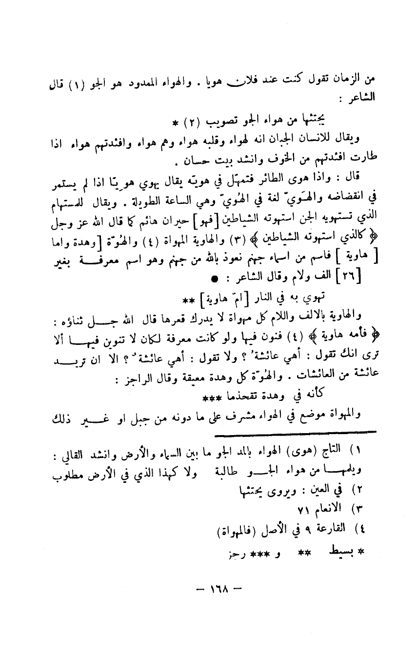 قال: وإذا هوى الطائر فتمهّل في هويّه يقال يهوي هوِيًّا إذا لم يستمر في انقضاضه والهَويّ لغة في الهُويّ وهي الساعة الطويلة. ويقال للمستهام الذي تستهويه الجن استهوته الشياطين فهو حيران هائم كما قال الله عز وجل {كالذي استهوته الشياطين} والهاوية المهواة والهُوّة وهدة وأما هاوية فاسم من أسماء جهنم نعوذ بالله من جهنم وهو اسم معرفة بغير ألف ولام وقال الشاعر: