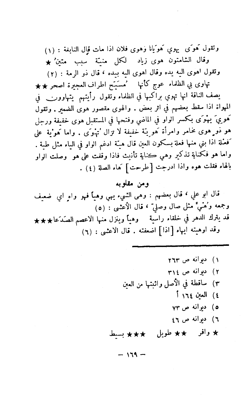 يصف الناقة أنها تهوي براكبها في الظلماء وتقول رأيتهم يتهاوون في المهواة إذا سقط بعضهم في أثر بعض. والهوى مقصور هوى الضمير. وتقول هَوِيَ يهْوَى بكسر الواو في الماضي وفتحها في المستقبل هوى خفيفة ورجل هو ذو هوى مخامر وامرأه هَوِيّة خفيفة لا تزال تُهْوَى. وأما هَوْية على فَعْلة إذا بني منها فعلة بسكون العين قال هيّة أدغم الواو في الياء مثل طية. وأما هو فكناية تذكير وهي كناية تأنيث فإذا وقفت على هو وصلت الواو بالهاء فقلت هوه وإذا أدرجت طرحت هَاء الصلة.