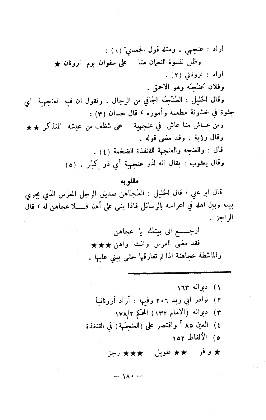 وقال الخليل: العُنْجُه الجافي من الرجال. وتقول إن فيه لعنجهية أي جفوة في خشونة مطعمه وأموره، قال حسان: