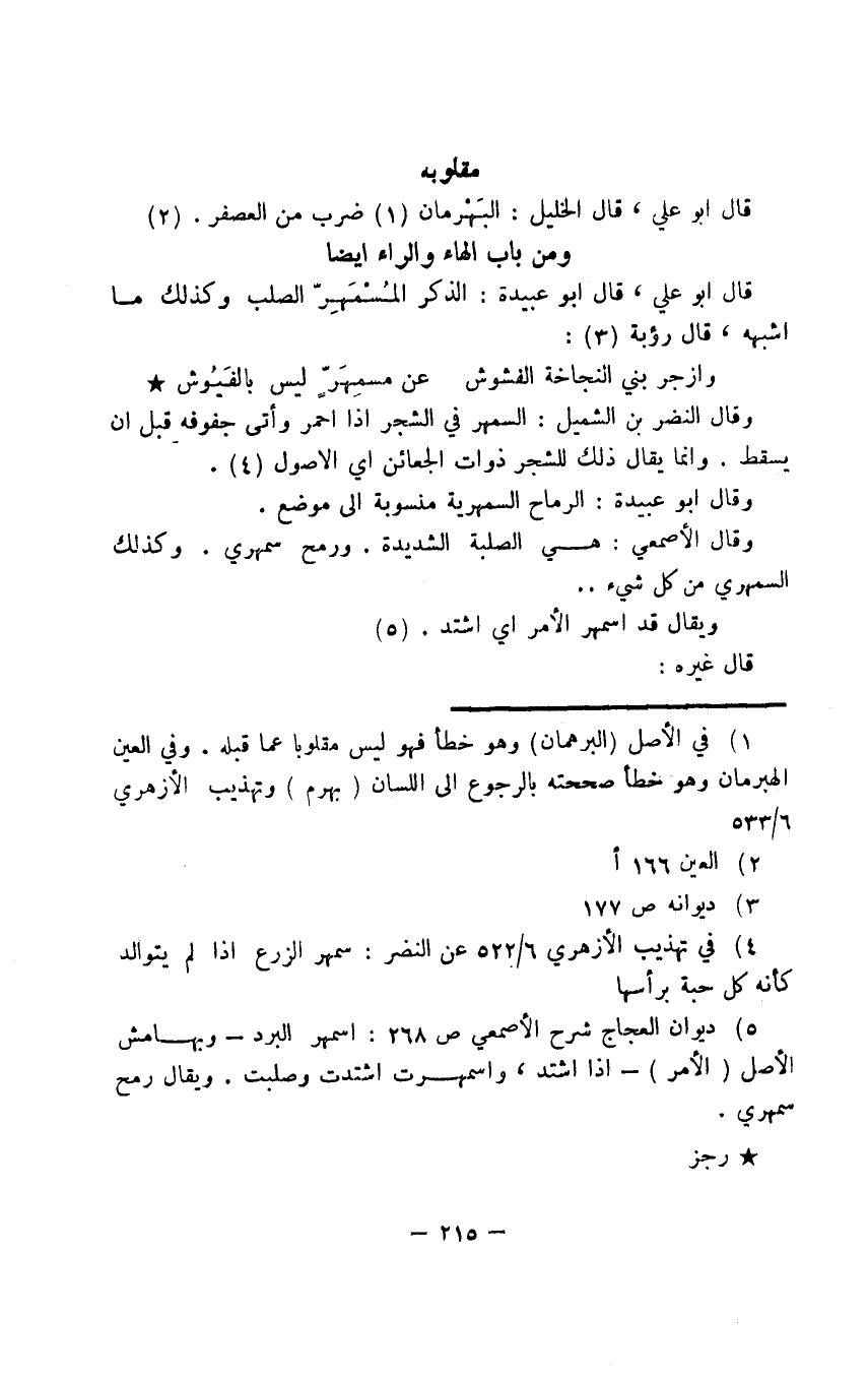 قال أبو علي، قال أبو عبيدة: الذكر المُسْمَهِرّ الصلب وكذلك ما أشبهه، قال رؤبة: