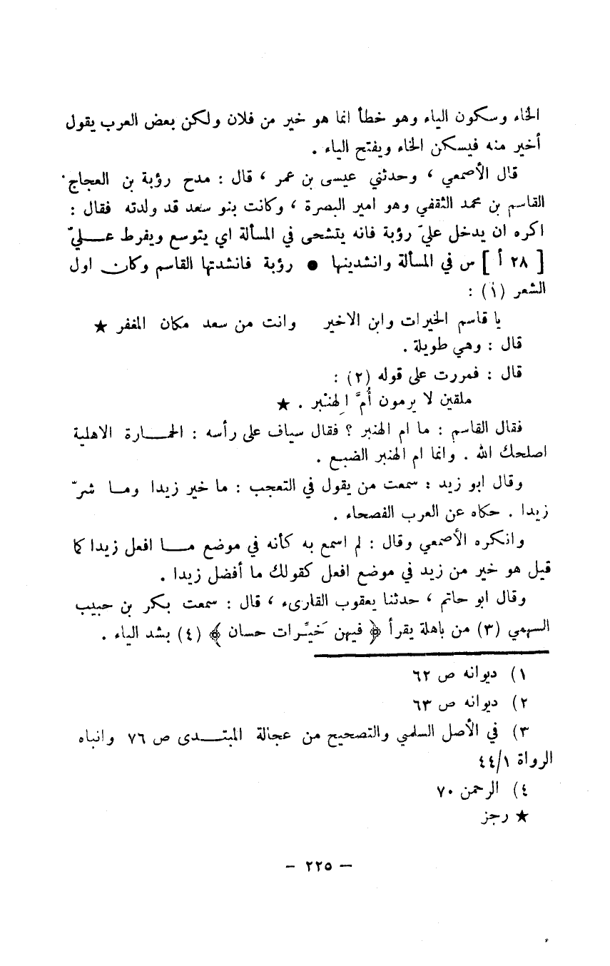 قال الأصمعي، وحدثني عيسى بن عمر، قال: مدح رؤبة بن العجاج القاسم بن محمد الثقفي وهو أمير البصرة، وكانت بنو سعد قد ولدته فقال: أكره أن يدخل عليّ رؤبة فإنه يتشحى في المسألة أي يتوسع ويفرط عليّ في المسألة وأنشدنيها رؤبة فأنشدتها القاسم وكان أول الشعر: