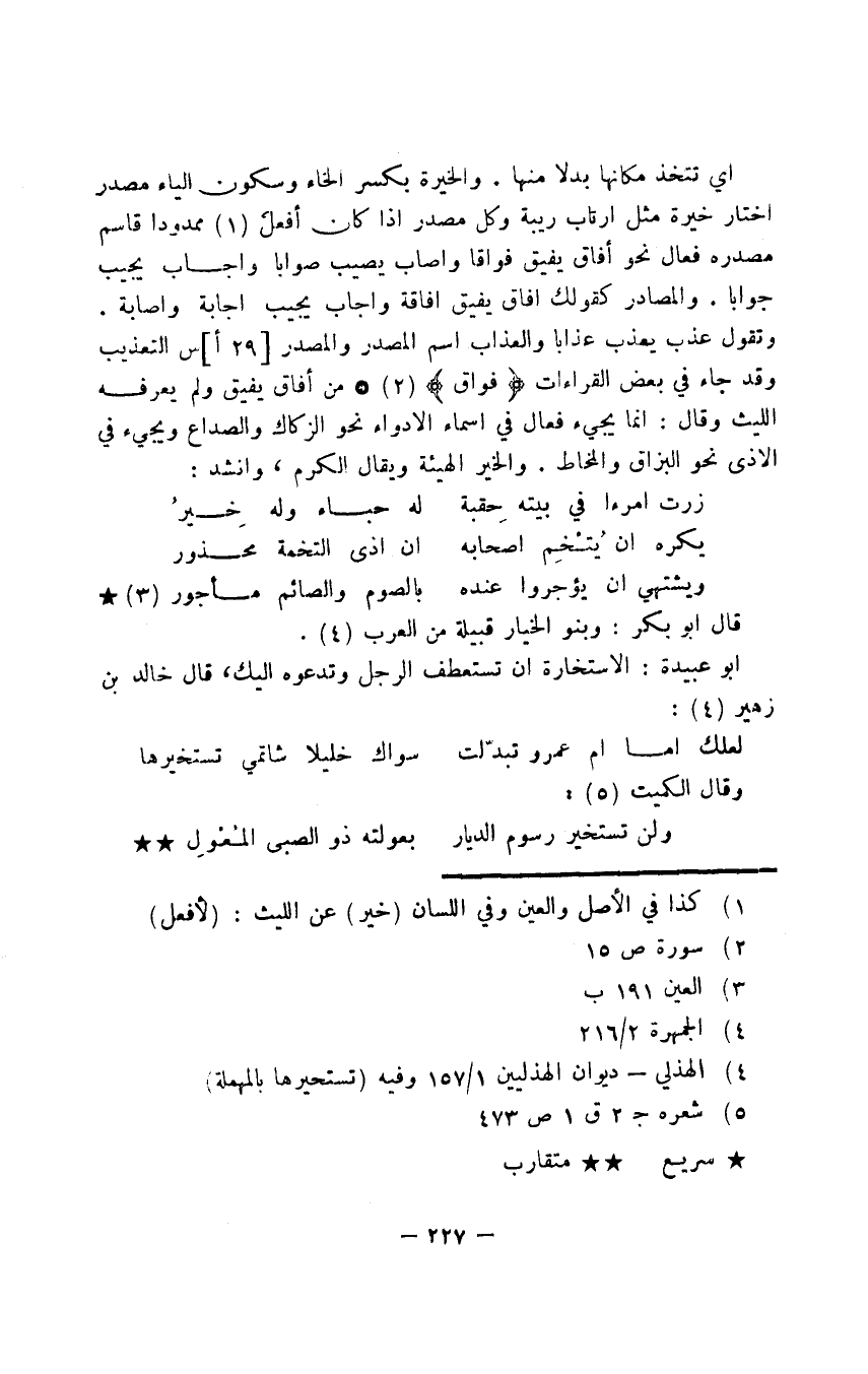 أي تتخذ مكانها بدلا منها. والخيرة بكسر الخاء وسكون الياء مصدر اختار خيرة مثل ارتاب ريبة وكل مصدر إذا كان أفعل ممدودا فاسم مصدره فعال نحو أفاق يفيق فواقا وأصاب يصيب صوابا وأجاب يجيب جوابا. والمصادر كقولك أفاق يفيق إفاقة وأجاب يجيب إجابة وإصابة. وتقول عذب يعذب عذابا والعذاب اسم المصدر والمصدر التعذيب وقد جاء في بعض القراءات {فواق} من أفاق يفيق ولم يعرفه الليث وقال: إنما يجيء فعال في أسماء الأدواء نحو الزكاك والصداع ويجيء في الأذى نحو البزاق والمخاط. والخير الهيئة ويقال الكرم، وأنشد: