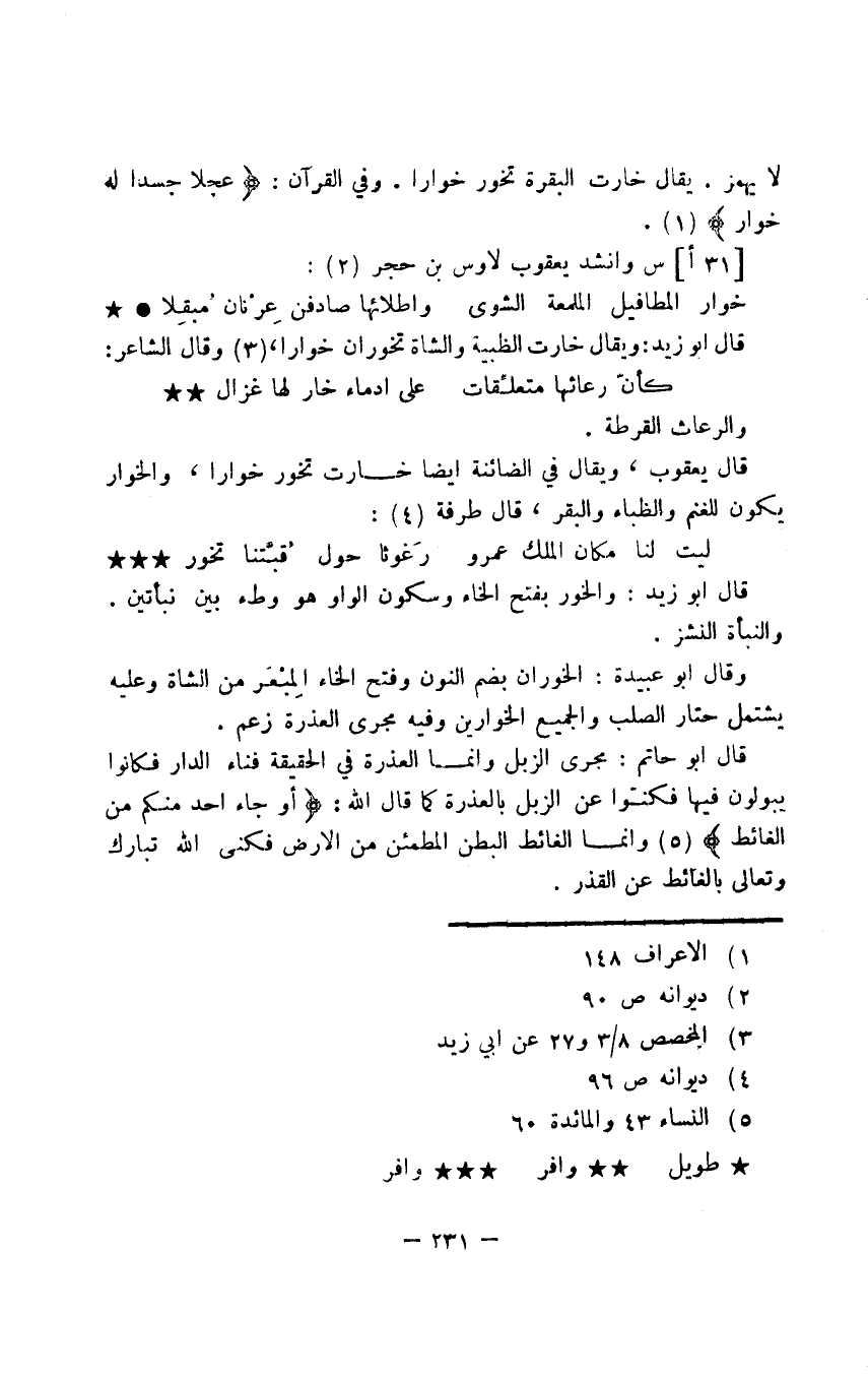 قال يعقوب، ويقال في الضائية أيضا خارت تخور خوارا، والخوار يكون للغنم والظباء والبقر، قال طرفة: