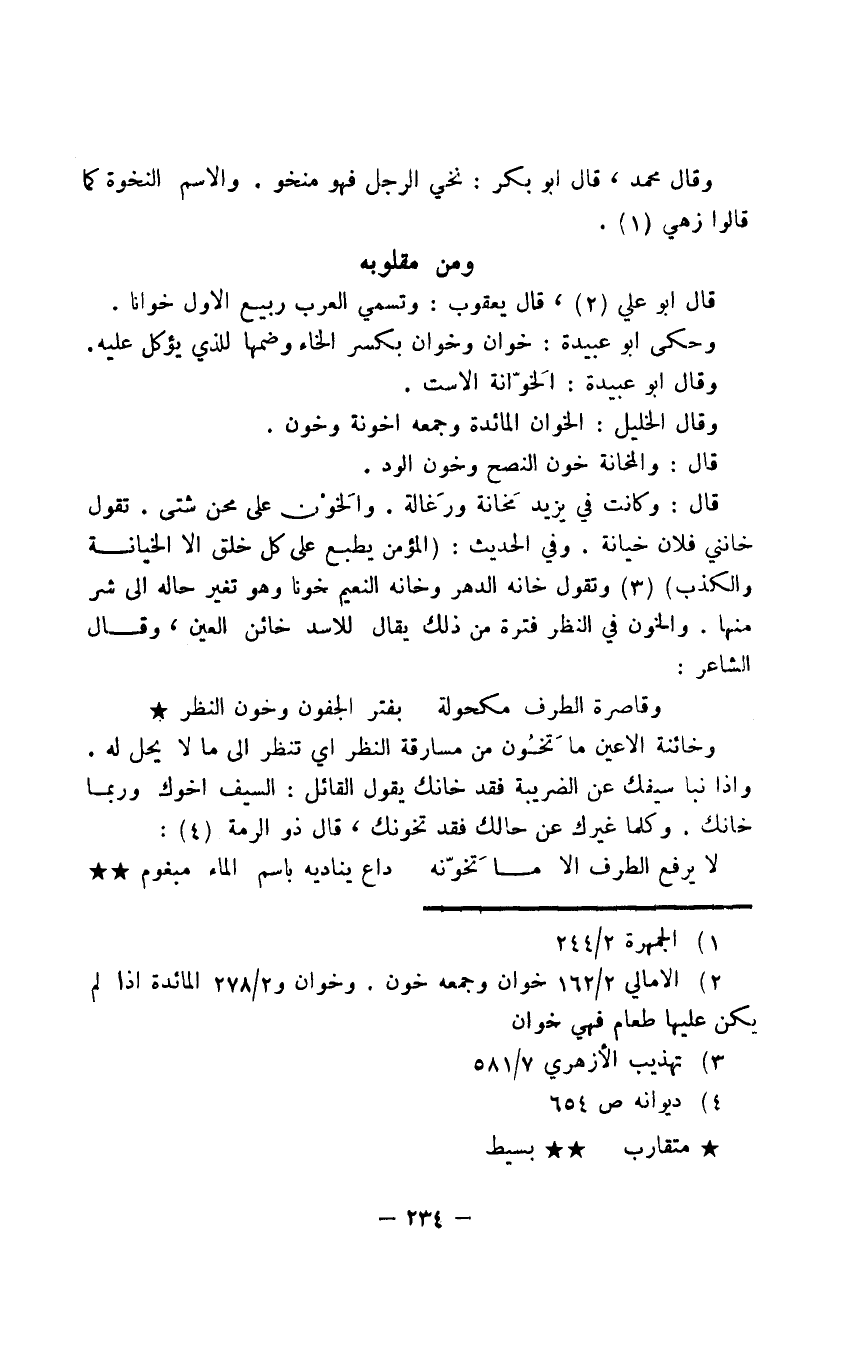 قال: وكانت في يزيد مخانة ورَغالة. والخَوْن على محن شتى. تقول خانني فلان خيانة. وفي الحديث: "المؤمن يطبع على كل خلق إلا الخيانة والكذب" وتقول خانه الدهر وخانه النعيم خونا وهو تغير حاله إلى شر منها. والخون في النظر فترة من ذلك يقال للأسد خائن العين، وقال الشاعر: