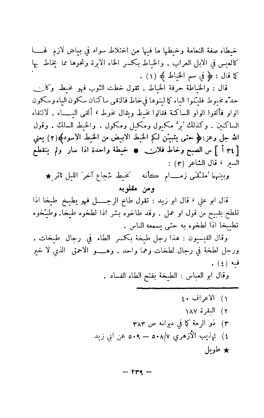 قال: والخياطة حرفة الخياط. تقول خطت الثوب فهو مخيط وكان حدّه مخيوط فليّنوا الياء كما لينوها في خاط فالتقى ساكنان سكون الياء وسكون الواو فألقوا الواو الساكنة فقالوا مخيط ويقال مخوط، ألقى الياء. لالتقاء الساكنين. وكذلك بُرُّ مكيول ومكيل ومكول. والخيط السلك. وقول الله عز وجل: {حتى يتبيّن لكم الخيط الأبيض من الخيط الأسود} يعني الصبح وخاط فلان خيطة واحدة إذا سار ولم ينقطع السير، قال الشاعر: