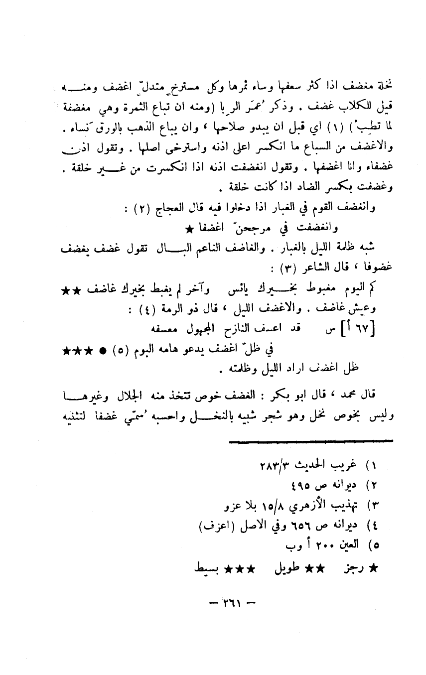 قال محمد، قال أبو بكر: الغضف خوص تتخذ منه الجلال وغيرها وليس بخوص نخل وهو شجر شبيه بالنخل وأحسبه سُمّي غضفا لتثنيه