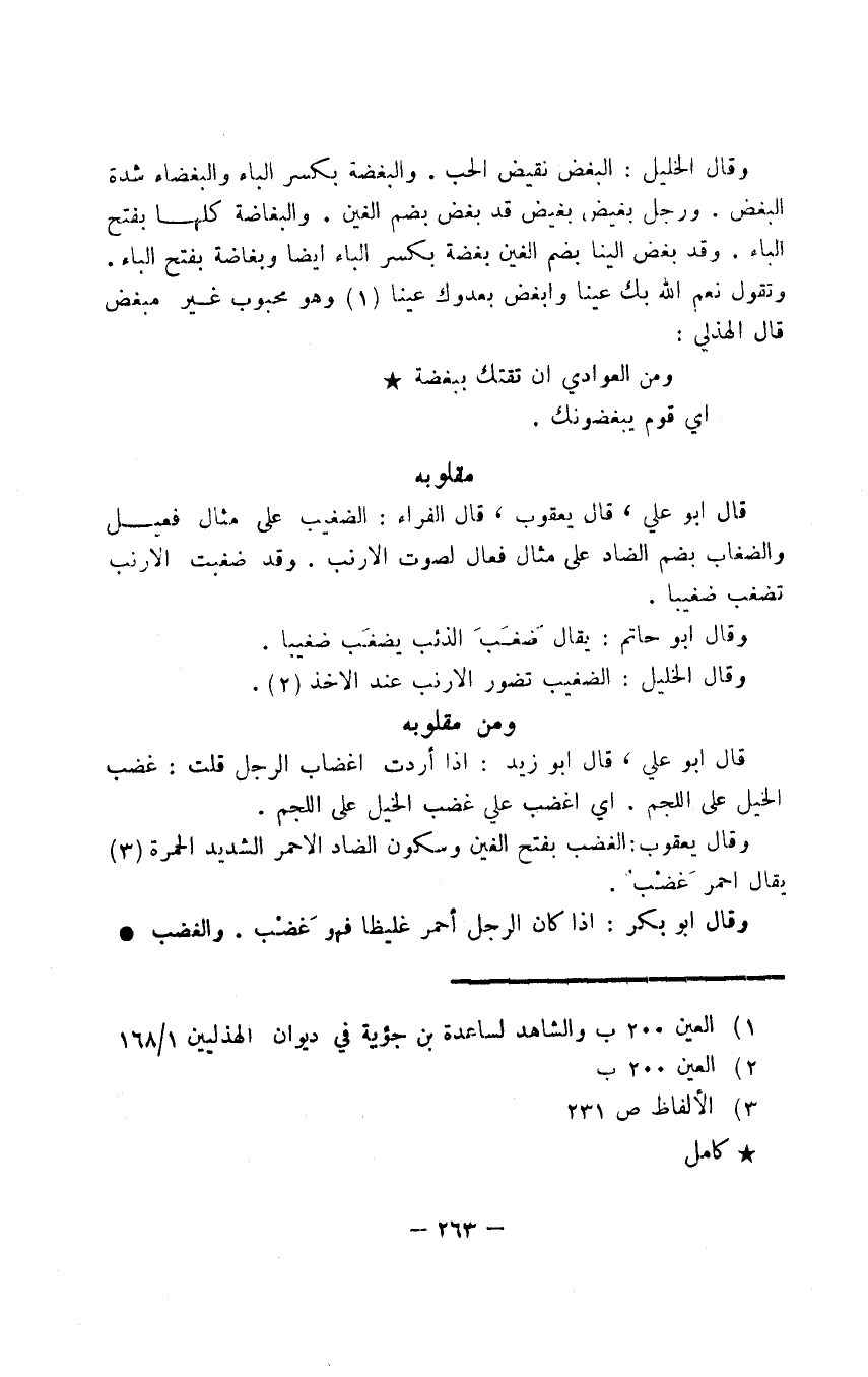 وقال الخليل: البغض نقيض الحب. والبغضة بكسر الباء والبغضاء شدة البغض. ورجل بغيض بغيض قد بغض بضم الغين. والبغاضة كلها بفتح الباء. وقد بغض إلينا بضم الغين بغضة بكسر الباء أيضا وبغاضة بفتح الباء. وتقول نعم الله بك عينا وأبغض بعدوك عينا وهو محبوب غير مبغض قال الهذلي: