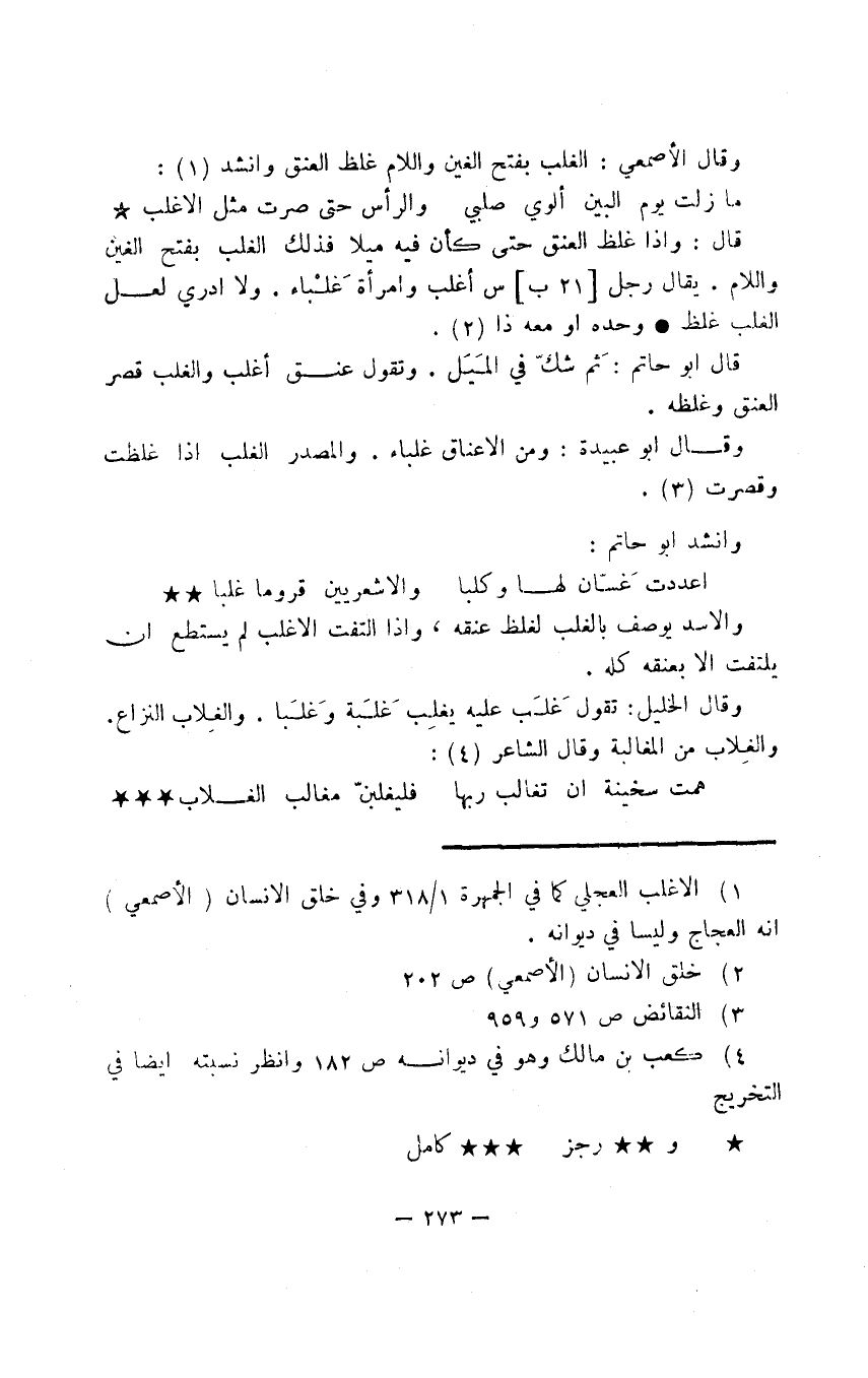 قال: وإذا غلظ العنق حتى كأن فيه ميلا فذلك الغلب بفتح الغين واللام. يقال رجل أغلب وامرأة غَلْباء ولا أدري لعل الغلب غلظ وحده أو معه ذا.