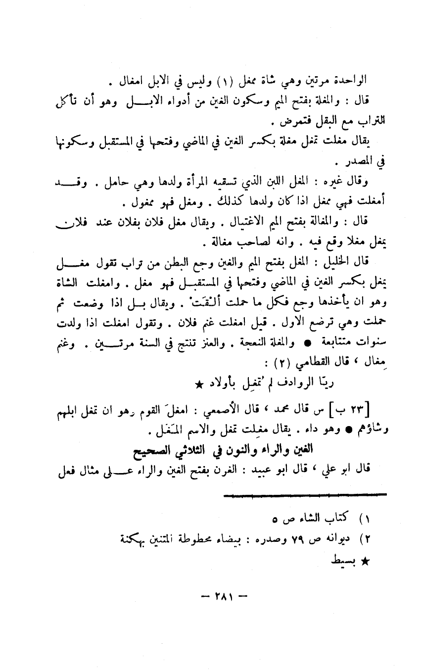 قال الخليل: المغل بفتح الميم والغين وجع البطن من تراب تقول مغل يمغل بكسر الغين في الماضي وفتحها في المستقبل فهو مغل. وأمغلت الشاة وهو أن يأخذها وجع فكل ما حملت ألْقَتْ. ويقال بل إذا وضعت ثم حملت وهي ترضع الأول. قيل أمغلت غنم فلان. وتقول أمغلت إذا ولدت سنوات متتابعة والمغلة النعجة. والعنز تنتج في السنة مرتين. وغنم مِغال، قال القطامي: