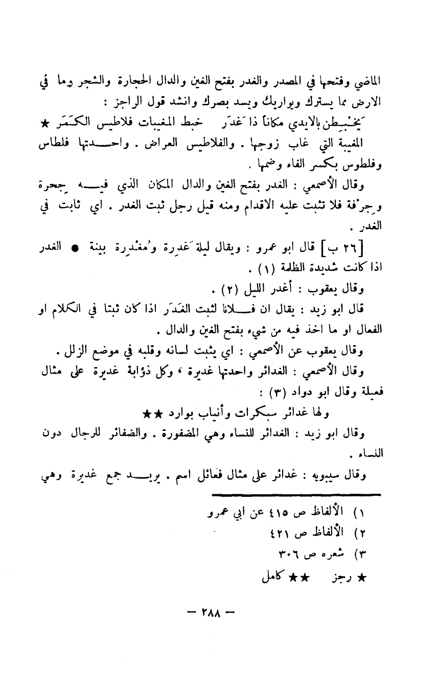 وقال الأصمعي: الغدر بفتح الغين والدال المكان الذي فيه جِحرة وجِرْفة فلا تثبت عليه الأقدام ومنه قيل رجل ثبت الغدر. أي ثابت في الغدر.
