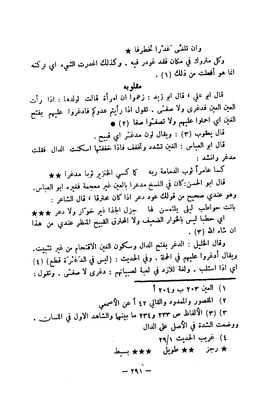قال أبو العباس: الغين تشدد وتخفف فإذا خففتها أسكنت الدال فقلت مدغر وأنشد: