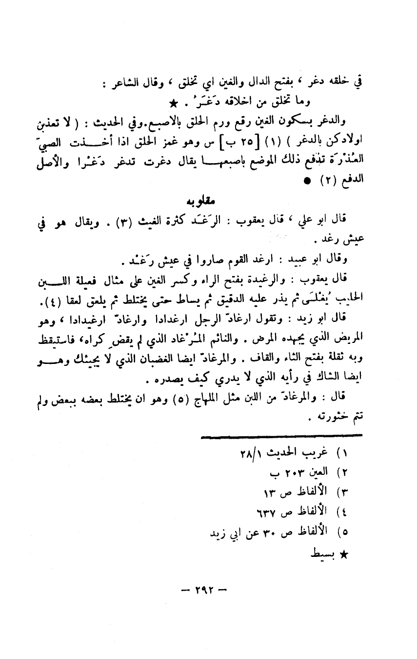 قال يعقوب: والرغيدة بفتح الراء وكسر الغين على مثال فعيلة اللبن الحليب يُغْلَى ثم يذر عليه الدقيق ثم يساط حتى يختلط ثم يلعق لعقا.