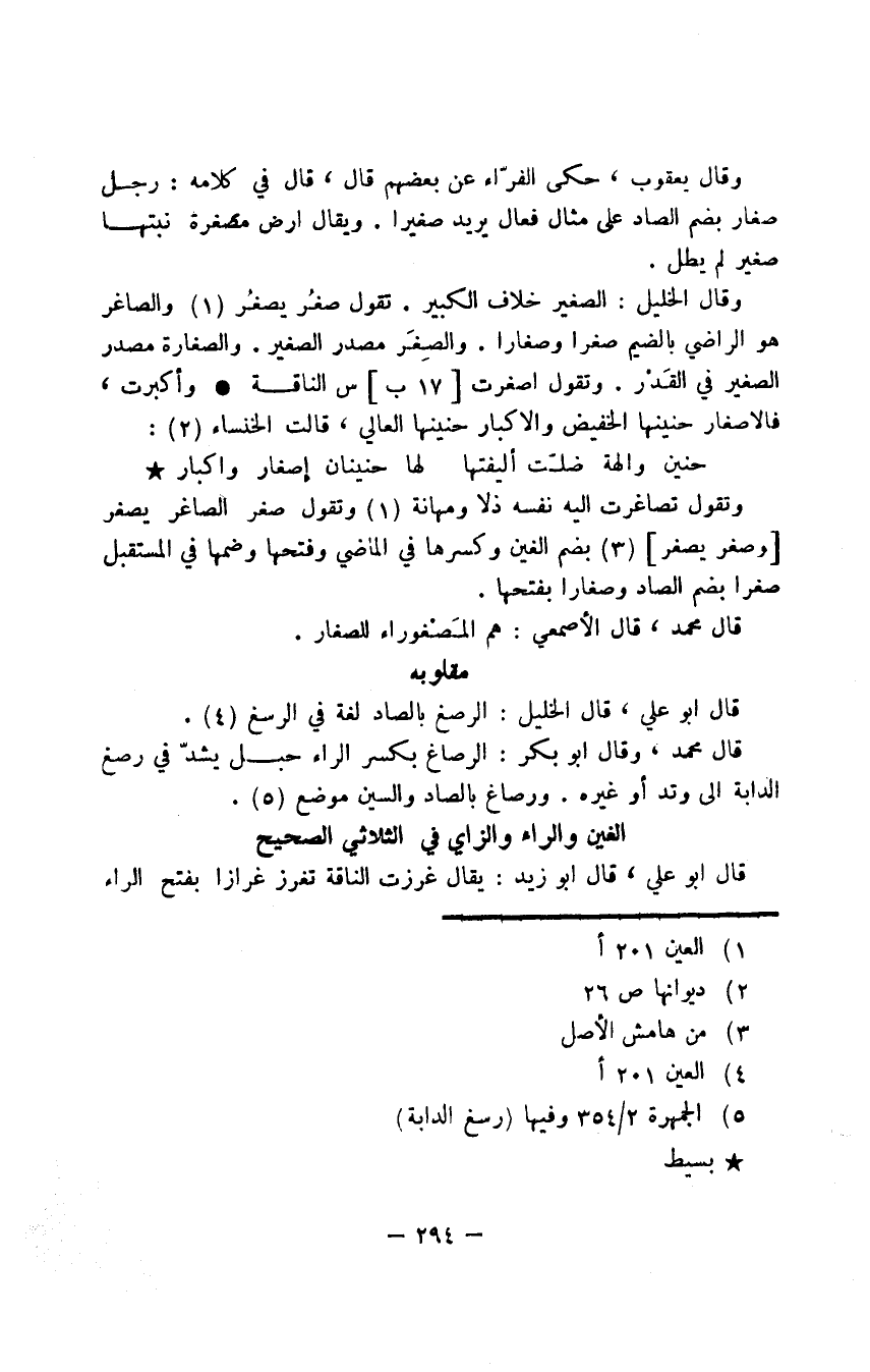 وقال الخليل: الصغير خلاف الكبير. وتقول صغُر يصغُر والصاغر هو الراضي بالضيم صغرا وصغارا. والصِّغَر مصدر الصغير. والصغارة مصدر الصغير في القَدْر. وتقول أصغرت الناقة وأكبرت، فالإصغار حنينها الخفيض والإكبار حنينها العالي، قالت الخنساء: