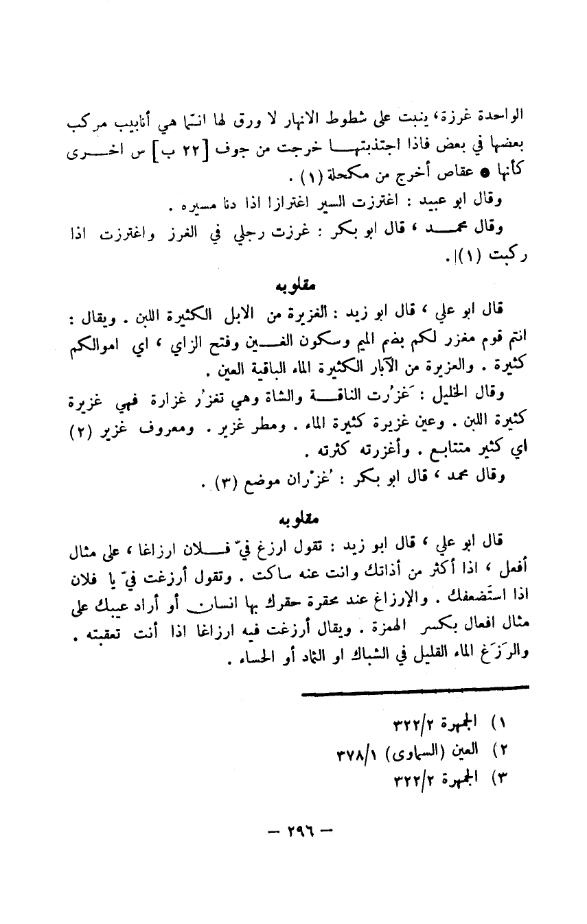 قال أبو علي، قال أبو زيد: الغزيرة من الإبل الكثيرة اللبن. ويقال: أنتم قوم مغزر لكم بضم الميم وسكون الغين وفتح الزاي، أي أموالكم كثيرة. والغزيرة من الآبار الكثيرة الماء الباقية العين.