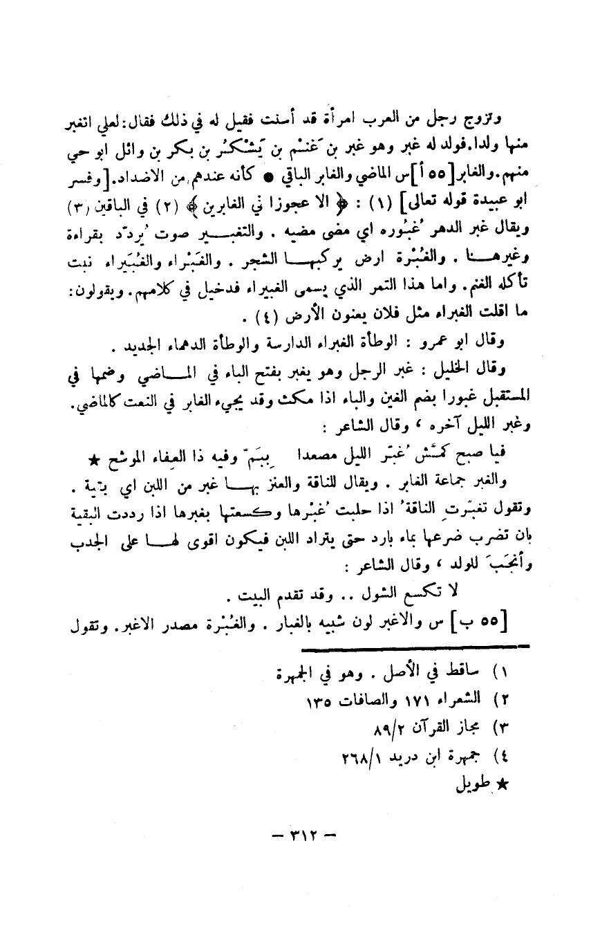 وتزوج رجل من العرب امرأة قد أسنت فقيل له في ذلك فقال: لعلي أتغبر منها ولدا. فولد له غبر وهو غبر بن غَنْم بن يَشْكُر بن بكر بن وائل أبو حي منهم. والغابر الماضي والغابر الباقي كأنه عندهم من الأضداد. وفسر أبو عبيدة قوله تعالى: {إلا عجوزا في الغابرين} في الباقين ويقال غبر الدهر غُبُوره أي مضى مضيه. والتغبير صوت يُردّد بقراءة وغيرها. والغُبْرة أرض يركبها الشجر. والغَبْراء والغُبَيراء نبت تأكله الغنم. وأما هذا التمر الذي يسمى الغبيراء فدخيل في كلامهم. ويقولون: ما أقلت الغبراء مثل فلان يعنون الأرض.