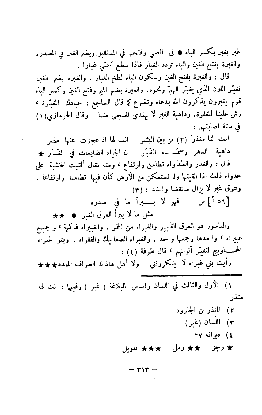 قال: والغبرة بفتح الغين وسكون الباء لطخ الغبار. والغبرة بضم الغين تغيّر اللون الذي يغبّر للهمّ ونحوه. والغبرة بضم الميم وفتح الغين وكسر الباء قوم يغبرون يذكرون الله بدعاء وتضرع كما قال الساجع: عبادك المغبَّرة، رش علينا المغفرة. وداهية الغبر لا يهتدي للمنجى منها. وقال الحرمازي في سنة أصابتهم: