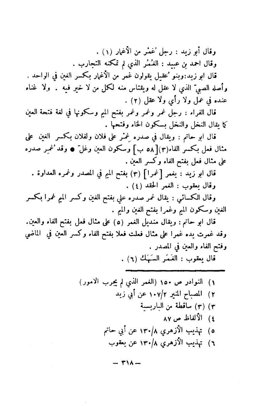 قال: أبو زيد: وبنو عُقيل يقولون غمر من الأغمار بكسر الغين في الواحد. وأصله الصبيّ الذي لا عقل له ويقتاس منه لكل من لا خير فيه. ولا غناء عنده في عمل ولا رأي ولا عقل.