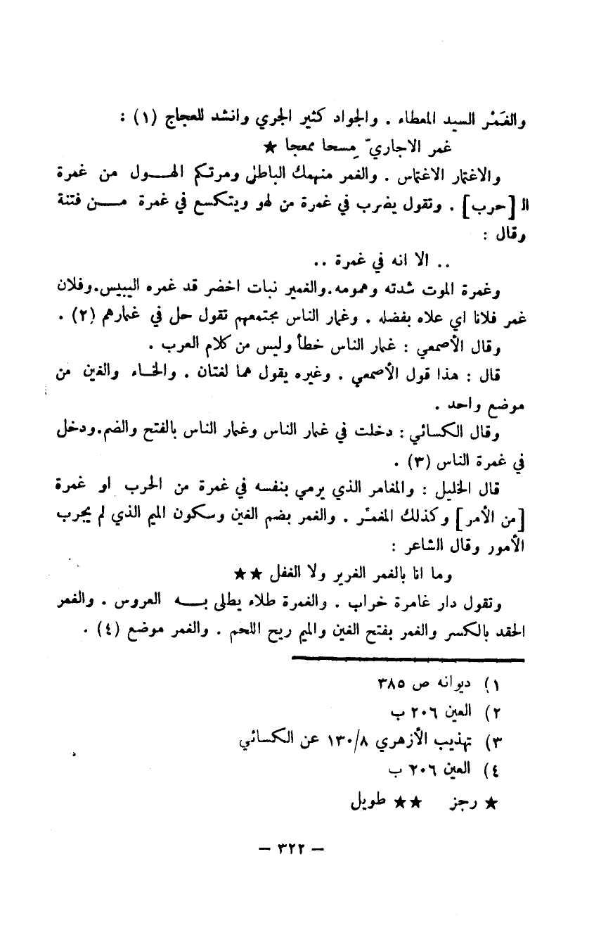 وتقول دار غامرة خراب. والغمرة طلاء يطلى به العروس. والغمر الحقد بالكسر والغمر بفتح الغين والميم ريح اللحم. والغمر موضع.