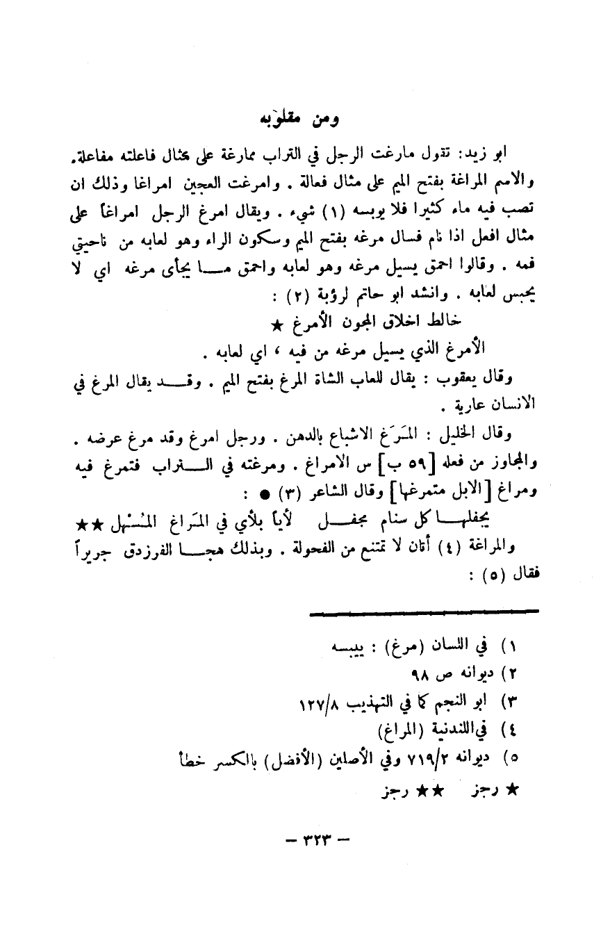 أبو زيد: تقول مارغت الرجل في التراب ممارغة على مثال فاعلته مفاعلة. والاسم المراغة بفتح الميم على مثال فعالة. وأمرغت العجين إمراغا وذلك أن تصب فيه ماء كثيرا فلا يربه شيء. ويقال أمرغ الرجل إمراغا على مثال أفعل إذا نام فسال مرغه بفتح الميم وسكون الراء وهو لعابه من ناحيتي فمه. وقالوا أحمق يسيل مرغه وهو لعابه وأحمق ما يجأى مرغه أي لا يحبس لعابه. وأنشد أبو حاتم لرؤبة: