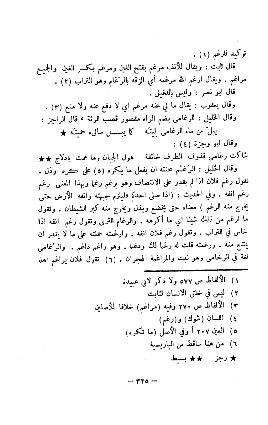 وقال الخليل: الرَّغْم محنته أن يفعل ما يكره على كره وذل. تقول رغم فلان إذا لم يقدر على الانتصاف وهو يرغم رغما وبهذا المعنى رغم رغم أنفه. وفي الحديث: "إذا صلى أحدكم فليلزم جبهته وأنفه الأرض حتى يخرج منه الرغم" معناه حتى يخضع ويذل ويخرج منه كبر الشيطان. وتقول ما أرغم من ذلك شيئا أي ما أكرهه. والرغام الثرى وتقول رغم أنفه إذا خاس في التراب. وتقول رغم فلان أنفه. وأرغمته حملته على ما لا يقدر أن يمتنع منه. ورغمته قلت له رغما لك ودغما. وهو راغم داغم. والرُّغامى لغة في الرخامى وهو نبت والمراغمة الهجران. تقول فلان يراغم أهله