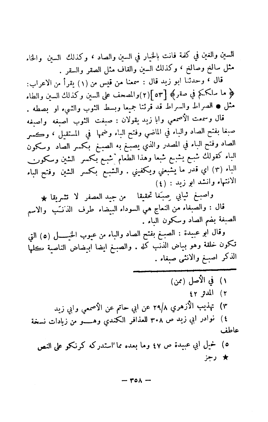 قال، وحدثنا أبو زيد قال: سمعنا من قيس من يقرأ من الأعراب: {ما سلككم في صقر} والمصحف على السين وكذلك السين والطاء مثل الصراط والسراط قد قرئتا جميعا وبسط الثوب والشيء أو بصطه. قال وسمعت الأصمعي وأبا زيد يقولان: صبغت الثوب أصبغه وأصبغه صبغا بفتح الصاد والباء في الماضي وفتح الباء وضمها في المستقبل، وكسر الصاد وفتح الباء في المصدر، والذي يصبغ به الصبغ بكسر الصاد وسكون الباء كقولك شبع يشبع شبعا وهذا الطعام شبع بكسر الشين وسكون الباء أي قدر ما يشبعني ويكفيني. والشبع بكسر الشين وفتح الباء الانتهاء وأنشد أبو زيد: