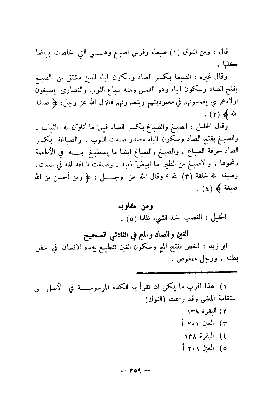 وقال الخليل: الصبغ والصباغ بكسر الصاد فيهما ما تُلوّن به الثياب. والصبغ بفتح الصاد وسكون الباء مصدر صبغت الثوب. والصباغة بكسر الصاد حرفة الصباغ. والصبغ والصباغ أيضا ما يصطبغ به في الأطعمة ونحوها. والأصبغ من الطير ما ابيضّ ذنبه. وصبغت الناقة لغة في سبغت. وصبغة الله خلقة الله، وقال الله عز وجل: {ومن أحسن من الله صبغة}.