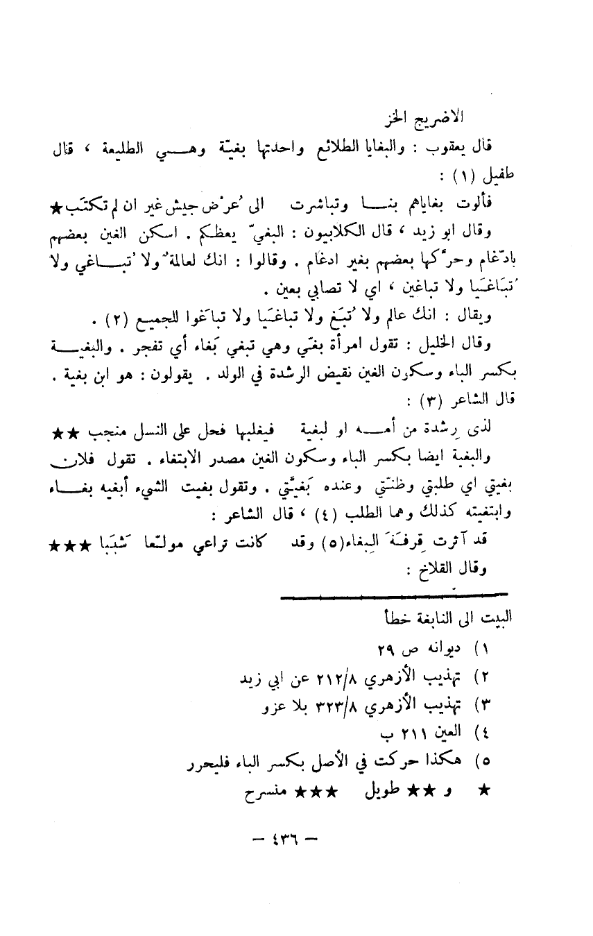 وقال الخليل: تقول امرأة بغيّ وهي تبغي بَغاء أي تفجر. والبغية بكسر الباء وسكون الغين نقيض الرشدة في الولد. يقولون: هو ابن بغية. قال الشاعر: