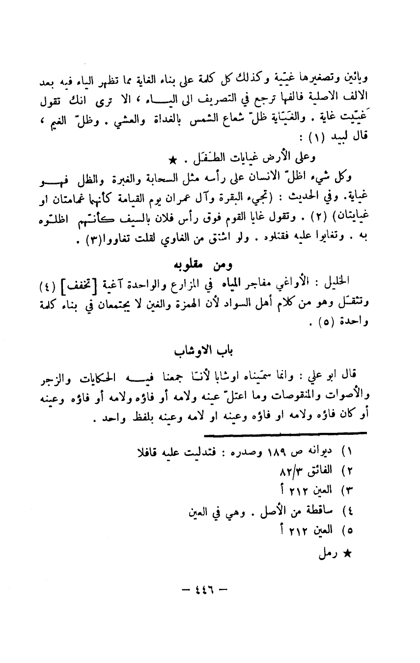 قال أبو علي: وإنما سمّيناه أوشابا لأنّا جمعنا فيه الحكايات والزجر والأصوات والمنقوصات وما اعتلّ عينه ولامه أو فاؤه ولامه أو فاؤه وعينه أو كان فاؤه ولامه أو فاؤه وعينه أو لامه وعينه بلفظ واحد.