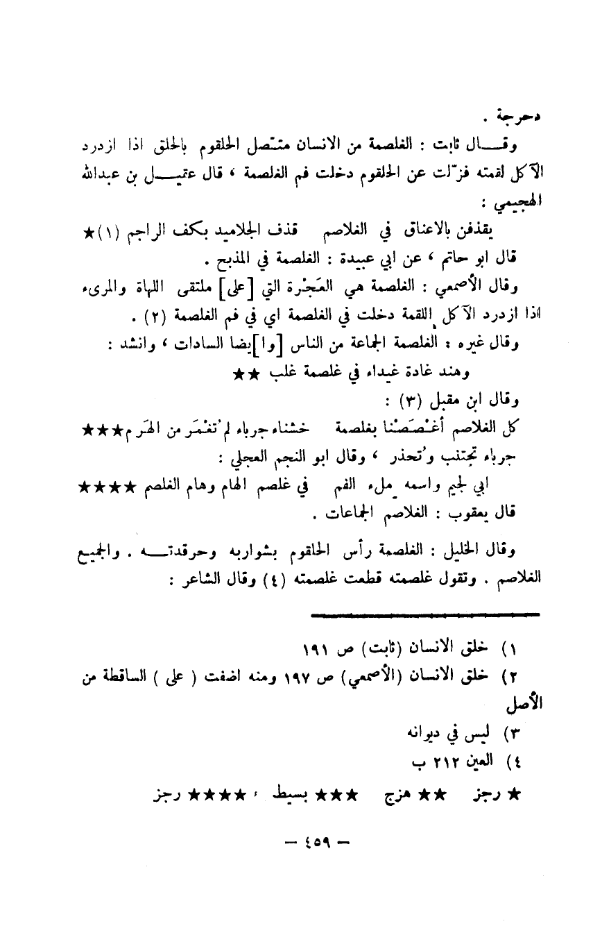 وقال ثابت: الغلصمة من الإنسان متّصل الحلقوم بالحلق إذا ازدرد الآكل لقمته فزلّت عن الحلقوم دخلت فم الغلصمة، قال عقيل بن عبد الله الهجيمي: