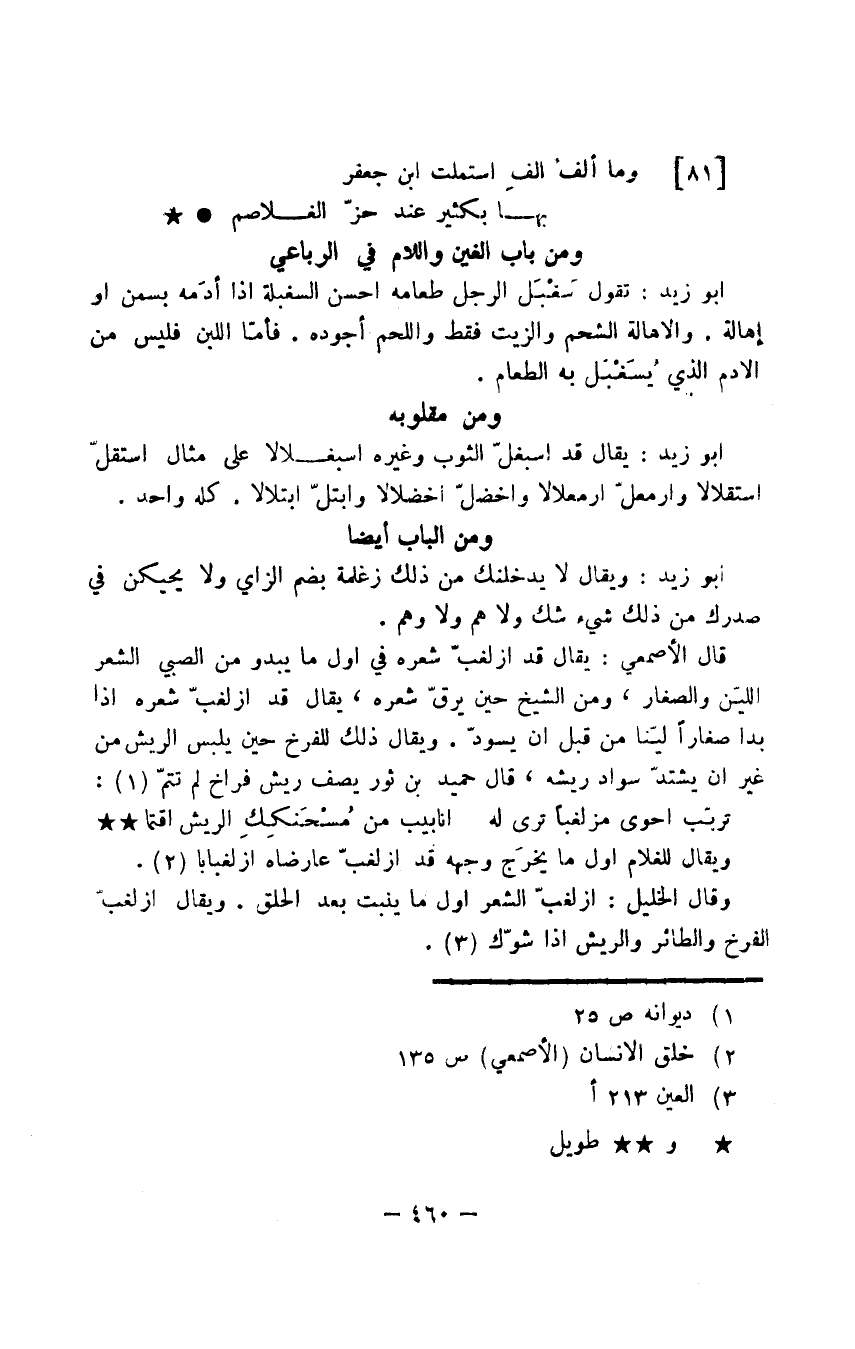 قال الأصمعي: يقال قد ازلغبّ شعره في أول ما يبدو من الصبي الشعر الليّن والصغار، ومن الشيخ حين يرقّ شعره، يقال قد ازلغبّ شعره إذا بدا صغارًا ليّنا من قبل أن يسودّ. ويقال ذلك للفرخ حين يلبس الريش من غير أن يشتدّ سواد ريشه، قال حميد بن ثور يصف ريش فراخ لم تتمّ: