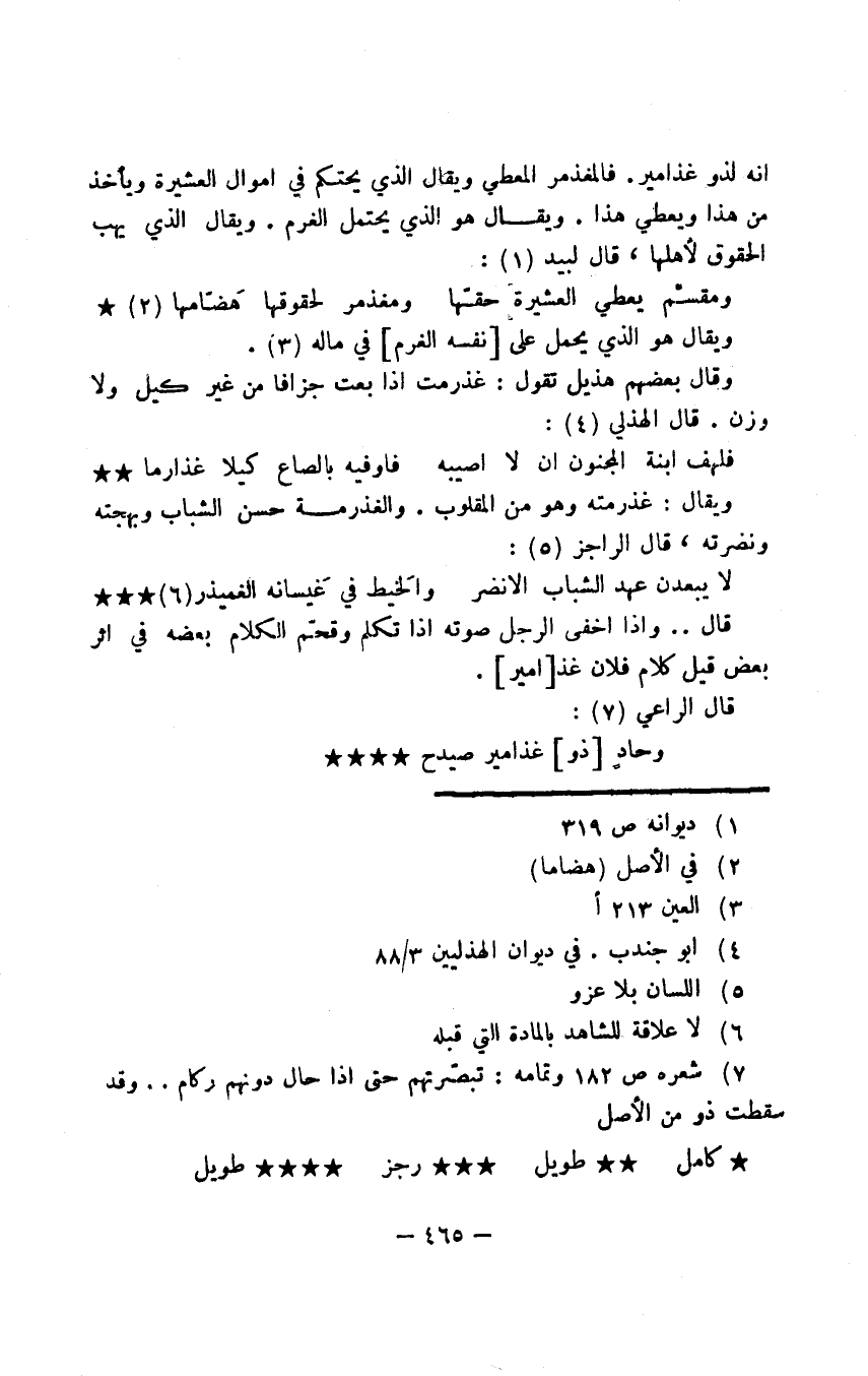 إنه لذو غذامير. فالمغذمر المعطي ويقال الذي يحتكم في أموال العشيرة ويأخذ من هذا ويعطي هذا. ويقال هو الذي يحتمل الغرم. ويقال الذي يهب الحقوق لأهلها، قال لبيد:
