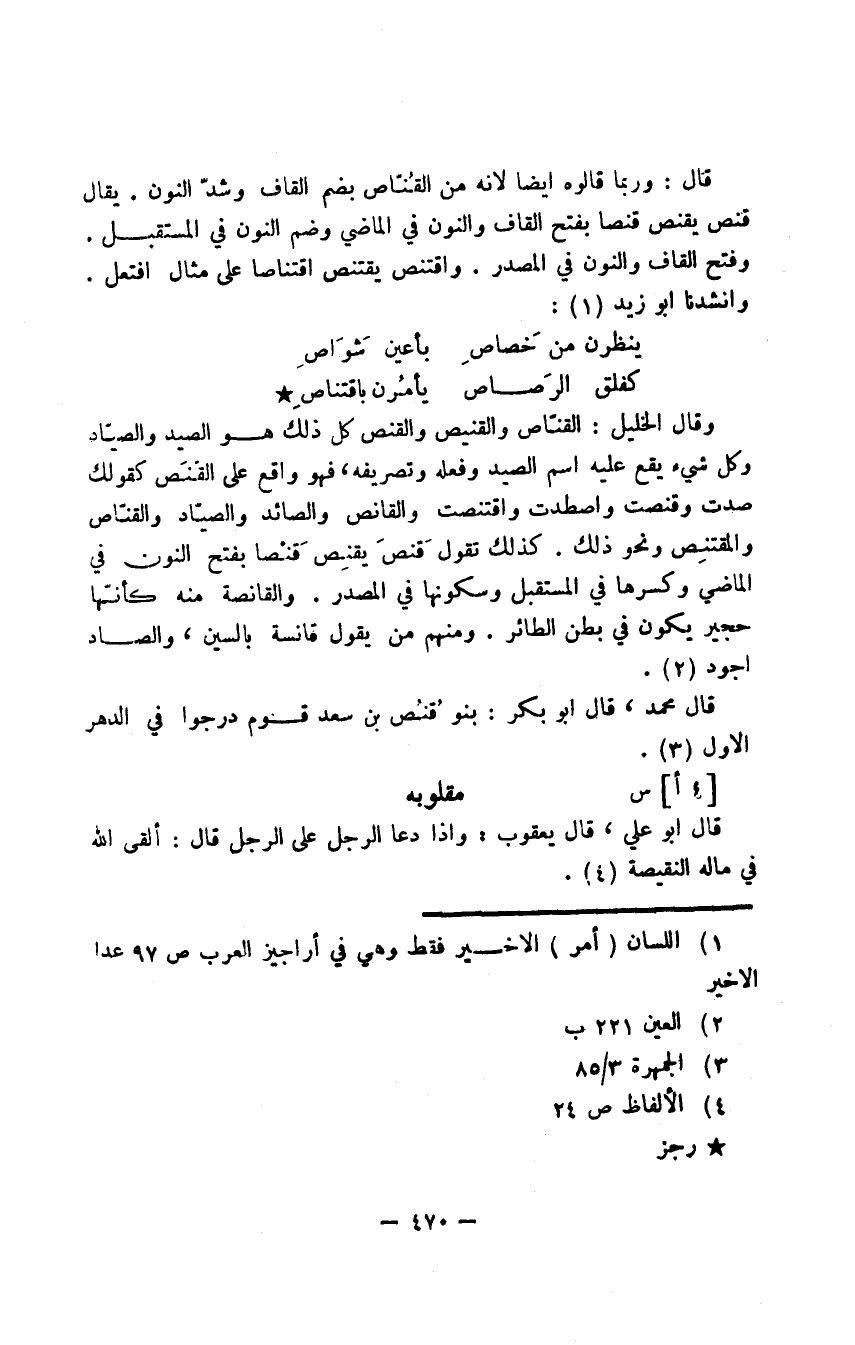 قال: وربما قالوه أيضا لأنه من القُنّاص بضم القاف وشدّ النون. يقال قنص يقنص قنصا بفتح القاف والنون في الماضي وضم النون في المستقبل. وفتح القاف والنون في المصدر. واقتنص يقتنص اقتناصا على مثال افتعل. وأنشدنا أبو زيد: