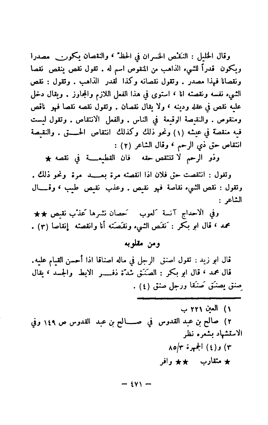 وقال الخليل: النَّقْص الخسران في الحظّ، والنقصان يكون مصدرا ويكون قدرًا للشيء الذاهب من المنقوص اسم له. تقول نقص ينقص نقصا ونقصانا فهذا مصدر. وتقول نقصانه وكذا لقدر الذاهب. وتقول: نقص الشيء نفسه ونقصته أنا، استوى في هذا الفعل اللازم والمجاوز. ويقال دخل عليه نقص في عقله ودينه، ولا يقال نقصان. وتقول نقصه نقصا فهو ناقص ومنقوص. والنقيصة الوقيعة في الناس. والفعل الانتقاص. وتقول ليست فيه منقصة في عيشه ونحو ذلك وكذلك انتقاص الحق. والنقيصة انتقاص حق ذي الرحم، وقال الشاعر: