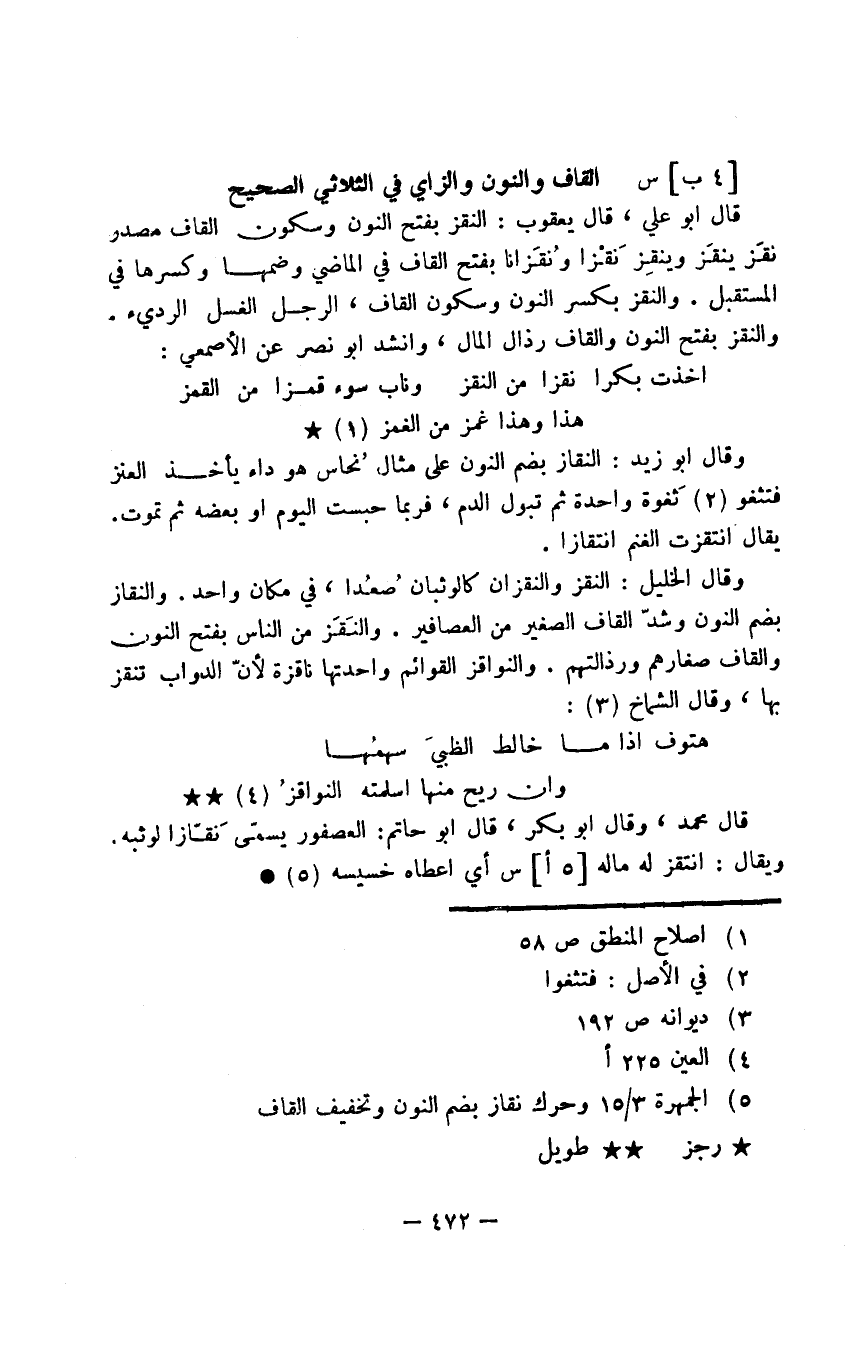 قال أبو علي، قال يعقوب: النقز بفتح النون وسكون القاف مصدر نقَز ينقَز وينقِز نَقْزا ونُقزانا بفتح القاف في الماضي وضمها وكسرها في المستقبل. والنقز بكسر النون وسكون القاف، الرجل الغسل الرديء. والنقز بفتح النون والقاف رذال المال، وأنشد أبو نصر عن الأصمعي: