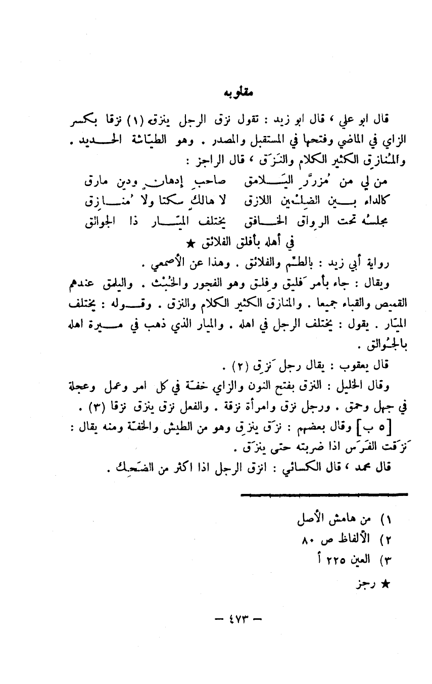 قال أبو علي، قال أبو زيد: تقول نزق الرجل ينزق نزقا بكسر الزاي في الماضي وفتحها في المستقبل والمصدر. وهو الطيّاشة الحديد. والمُنازِق الكثير الكلام والنَّزَق، قال الراجز: