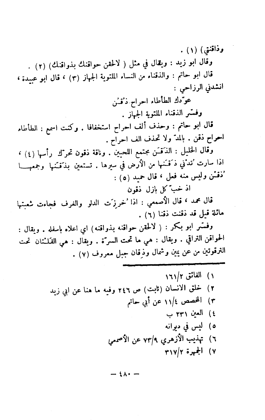 قال أبو حاتم: والذقناء من النساء الملتوية الجهاز، قال أبو عبيدة، أنشدني الزراحي: