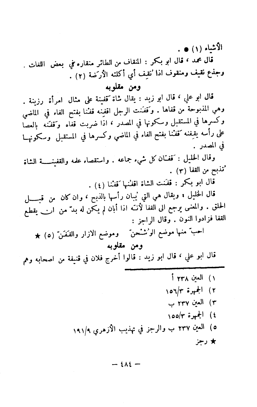 قال أبو علي، قال أبو زيد: يقال شاة قَفينة على مثال امرأة رزينة. وهي المذبوحة من قفاها. وقَفَنت الرجل أقفِنه قفْنا بفتح الفاء في الماضي وكسرها في المستقبل وسكونها في المصدر، إذا ضربت قفاه وقَفَنه بالعصا على رأسه يقفِنه قَفْنا بفتح الفاء في الماضي وكسرها في المستقبل وسكونها في المصدر.