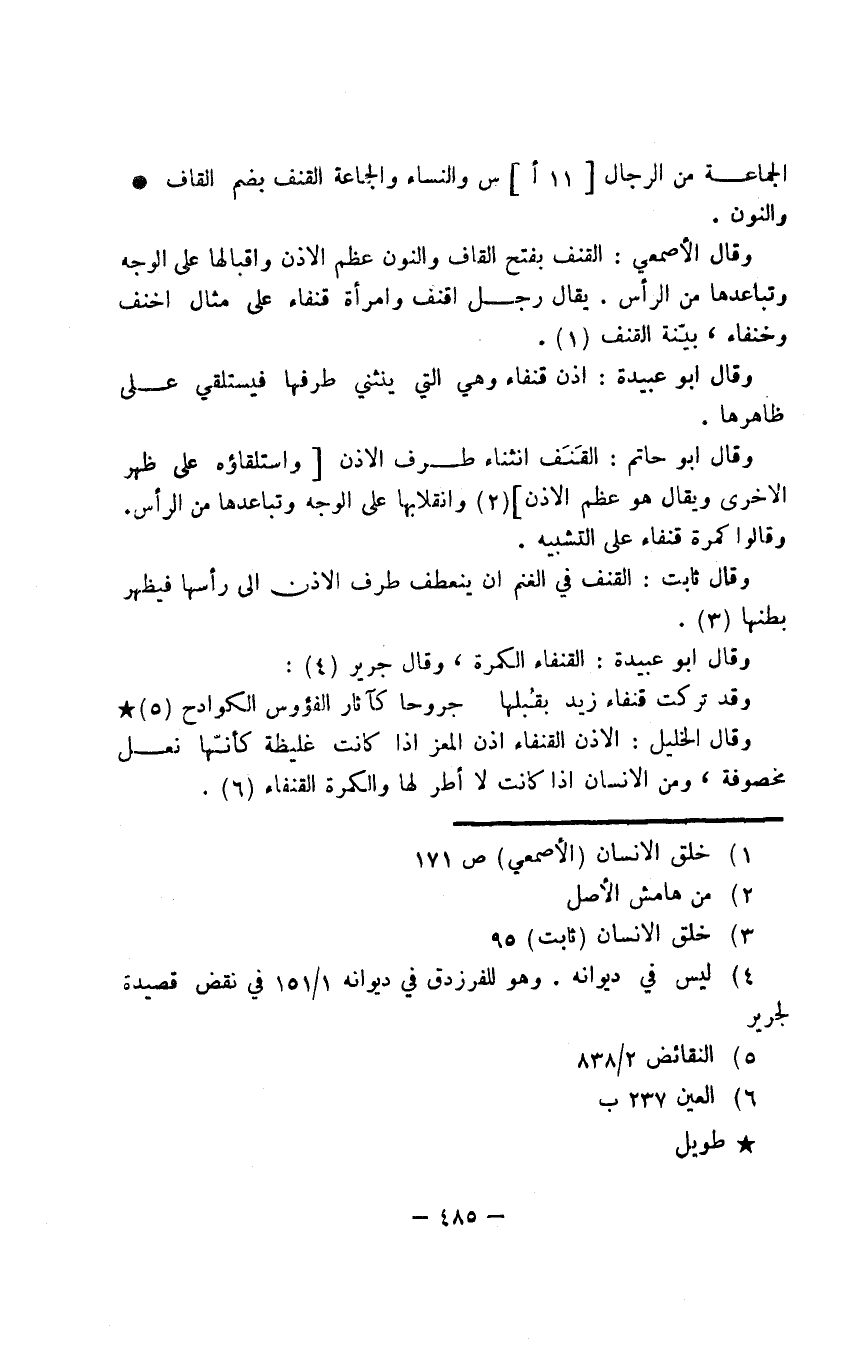 وقال الخليل: الأذن القنفاء أذن المعز إذا كانت غليظة كأنّها نعل مخصوفة، ومن الإنسان إذا كانت لا أطر لها والكمرة القنفاء.
