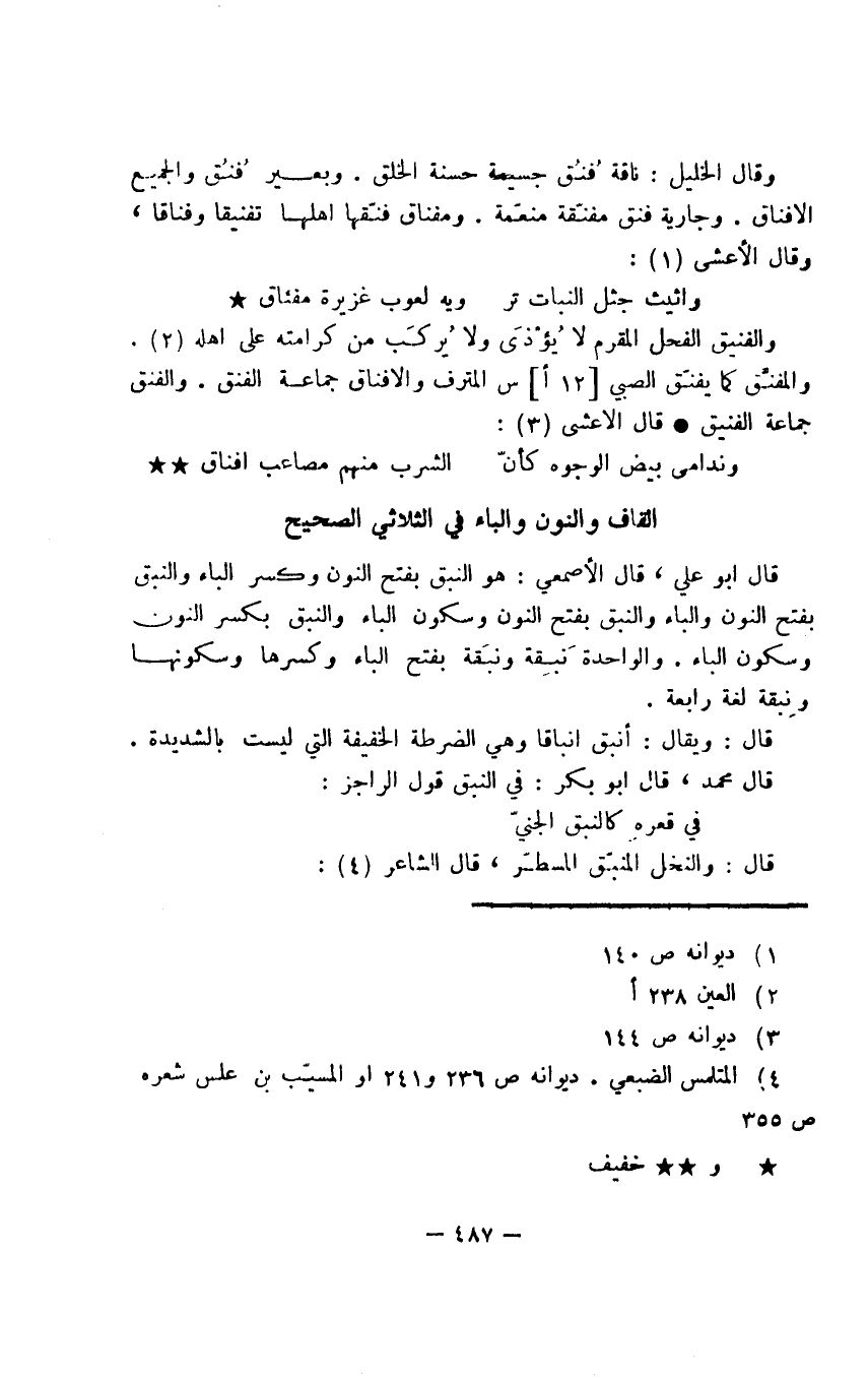 وقال الخليل: ناقة فُنُق جسيمة حسنة الخلق. وبعير فُنُق والجميع الأفناق. وجارية فنق مفنّعة منعّمة. ومفناق فنّقها أهلها تفنيقا وفناقا، وقال الأعشى: