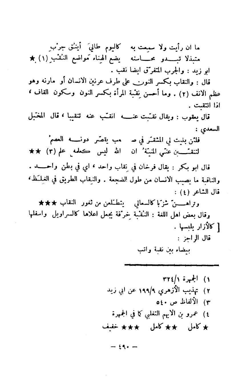 قال: والنقاب بكسر النون على طرف عرنين الإنسان أو مارنه وهو عظم الأنف. وما أحسن نِقْبة المرأة بكسر النون وسكون القاف، إذا انتقبت.