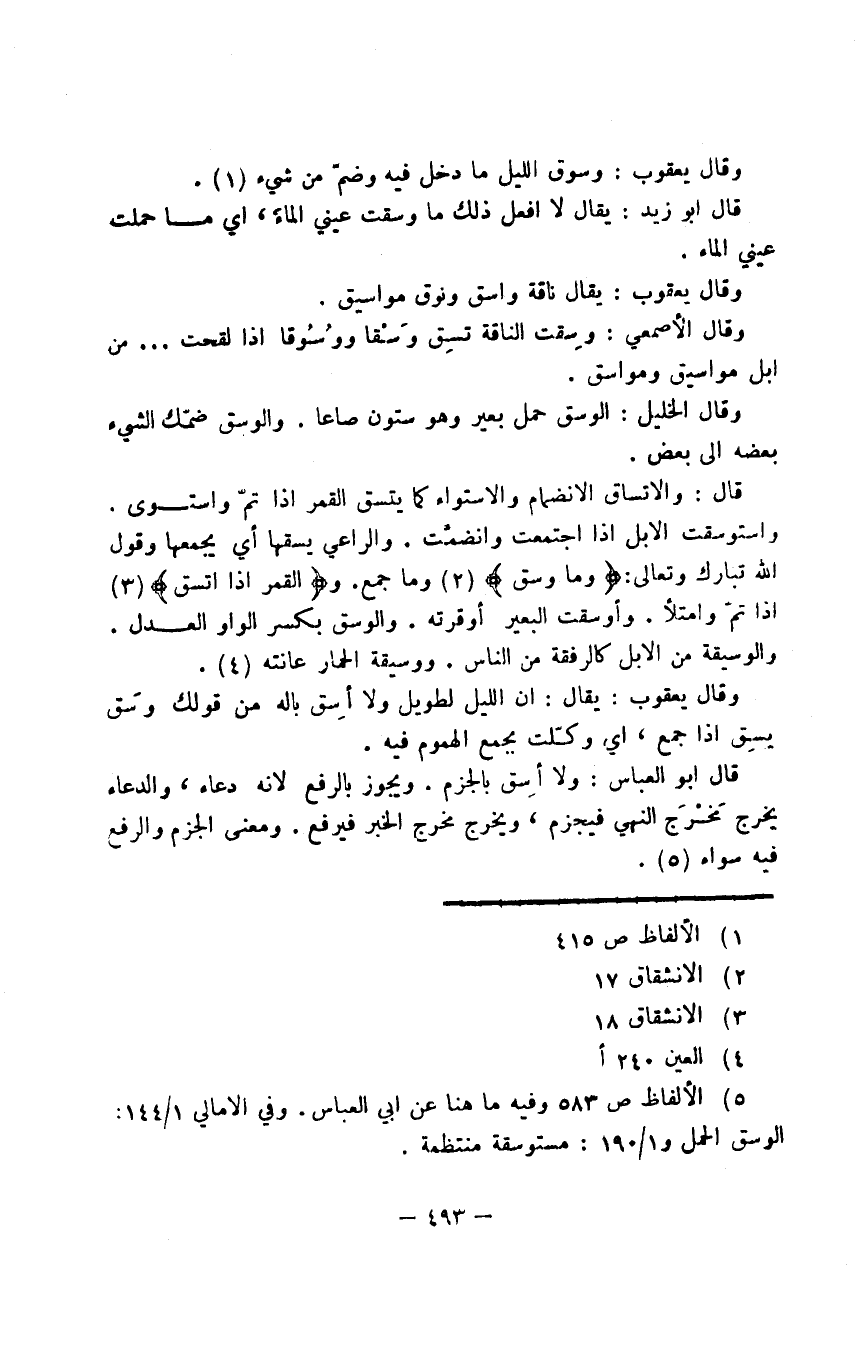 قال: والاتساق الانضمام والاستواء كما يتسق القمر إذا تمّ واستوى. واستوسقت الإبل إذا اجتمعت وانضمّت. والراعي يسقها أي يجمعها وقول الله تبارك وتعالى: {وما وسق} وما جمع. و {القمر إذا اتسق} إذا تمّ وامتلأ. وأوسقت البعير أوقرته. والوسق بكسر الواو العدل والوسيقة من الإبل كالرفقة من الناس. ووسيقة الحمار عانته.