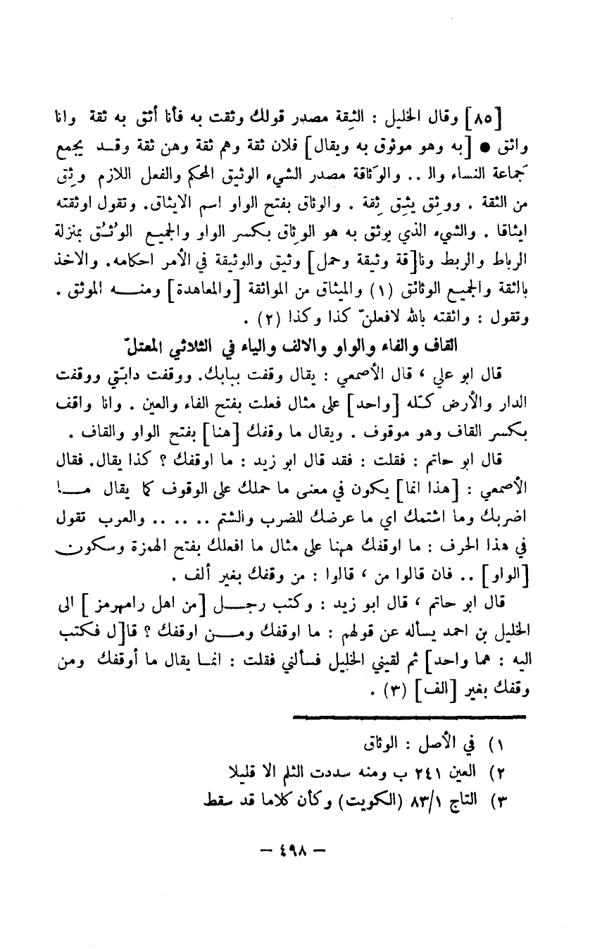 وقال الخليل: الثِّقة مصدر قولك وثقت به فأنا أثق به ثقة وأنا واثق به وهو موثوق به ويقال فلان ثقة وهو ثقة وهن ثقة وقد يجمع جَماعة النساء والـ .. والوَثاقة مصدر الشيء الوثيق المحكم والفعل اللازم وثِق من الثقة. ووثِق يثِق ثِقة. والوثاق بفتح الواو اسم الإيثاق. وتقول أوثقته إيثاقا. والشيء الذي يوثق به هو الوِثاق بكسر الواو والجميع الوُثُق بمنزلة الرباط والربط وناقة وثيقة وحمل وثيق والوثيقة في الأمر إحكامه. والأخذ بالثقة والجميع الوثائق والميثاق من المواثقة والمعاهدة ومنه الموثق. وتقول: واثقته بالله لأفعلن كذا وكذا.