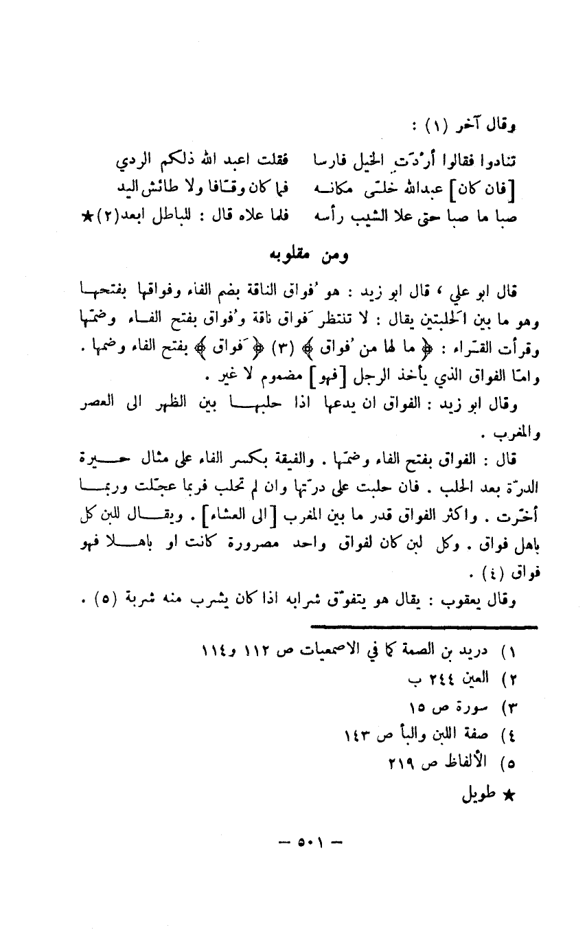 قال: الفواق بفتح الفاء وضمها. والفيقة بكسر الفاء على مثال حيرة الدرّة بعد الحلب. فإن حلبت على درّتها وإن لم تحلب فربما عجّلت وربما أخّرت. وأكثر الفواق قدر ما بين المغرب إلى العشاء. ويقال للبن كل باهل فواق. وكل لبن كان لفواق واحد مصرورة كانت أو باهلا فهو فواق.