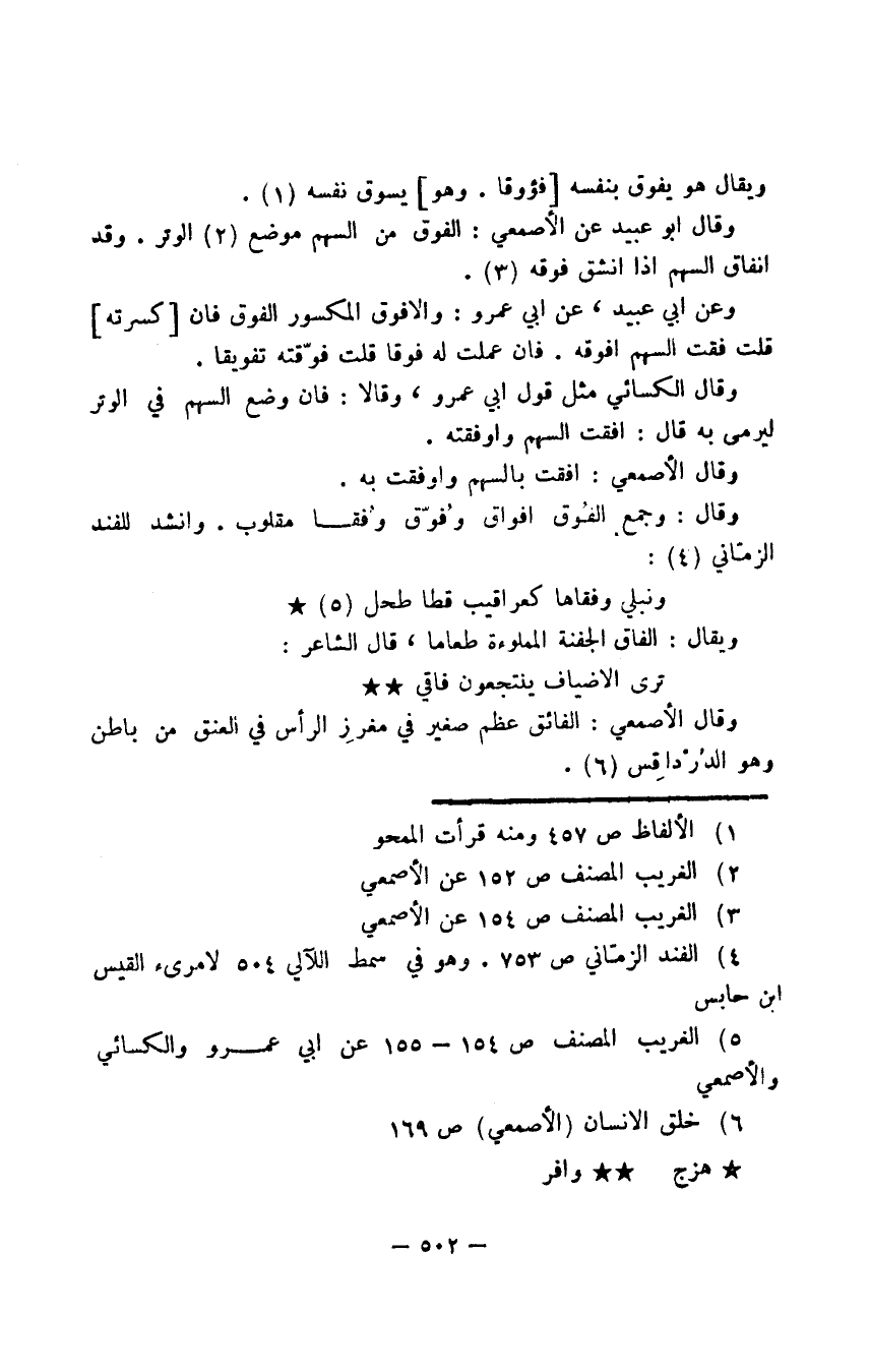 وعن أبي عبيد، عن أبي عمرو: والأفوق المكسور الفوق فإن كسرته قلت فقت السهم أفوقه. فإن عملت له فوقا قلت فوّقته تفويقا.